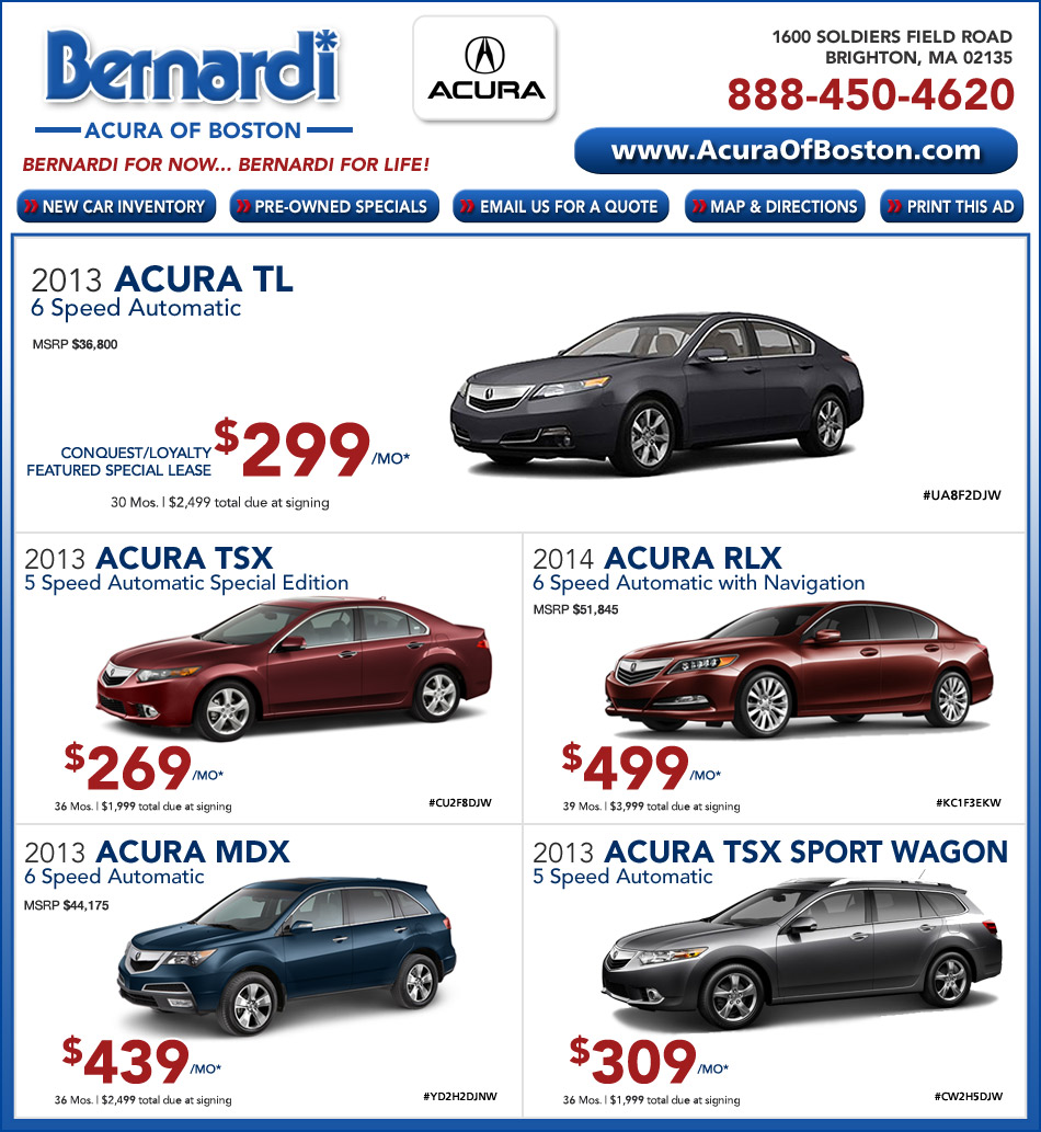 | Includes down payment with no security deposit. Excludes taxes, titles and fees. For well-qualified lessees available from March 5, 2013 through April 30, 2013, available to customers who qualify for the Acura Financial Services Super Preferred or Preferred credit tier. Not all lessees will qualify. Higher lease rates apply for lessees with lower credit ratings. (includes destination, excludes tax, license, title fees, registration, documentation fees, options, insurance and the like). Must take new retail delivery on vehicle from dealer stock by April 30, 2013. Lessee responsible for maintenance, excessive wear/tear and 15¢/mile over 10,000 miles/year for vehicles with MSRP less than $30,000, and 20¢/mile over 10,000 miles/year for vehicles with MSRP of $30,000 or more. See your Acura dealer for complete details. |