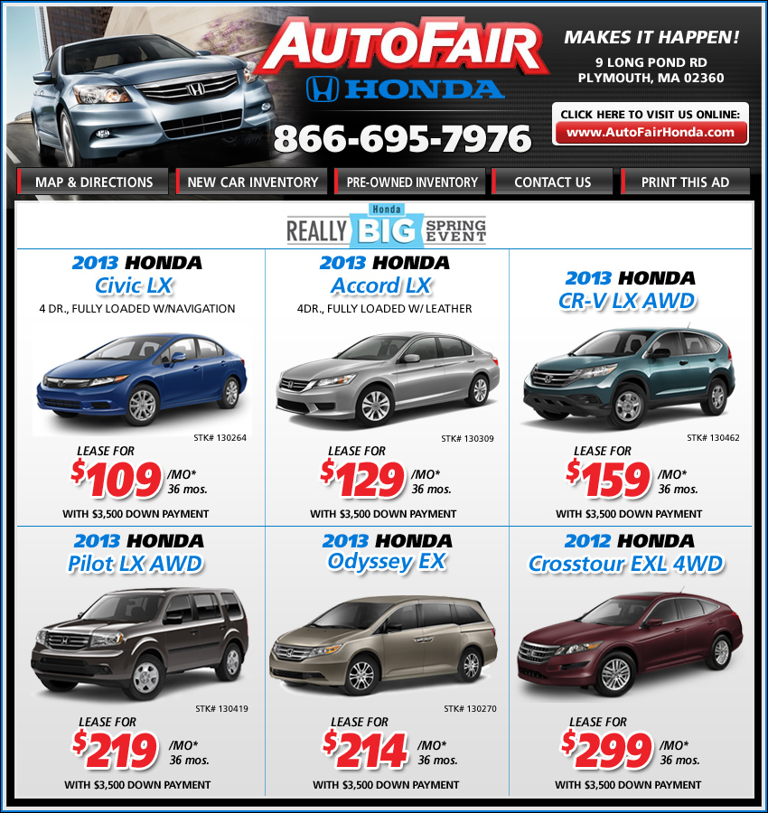 All lease specials are for 36 months, 12,000 miles per year. All specials require down payment of $3,500 or equivalent trade-in at signing. Tax, tags, first months payment, and title fees are additional depending on residency. Please see dealer for details. Sale ends 4/30/13.