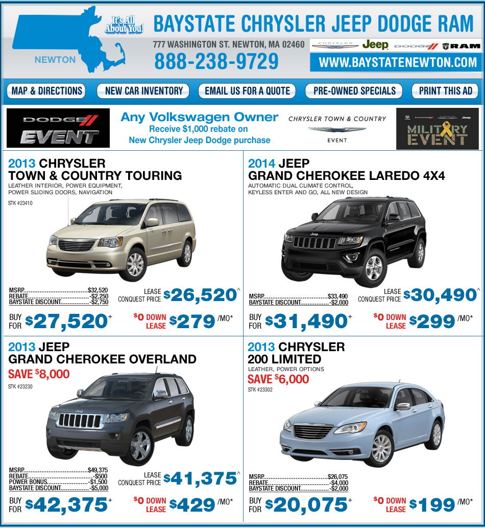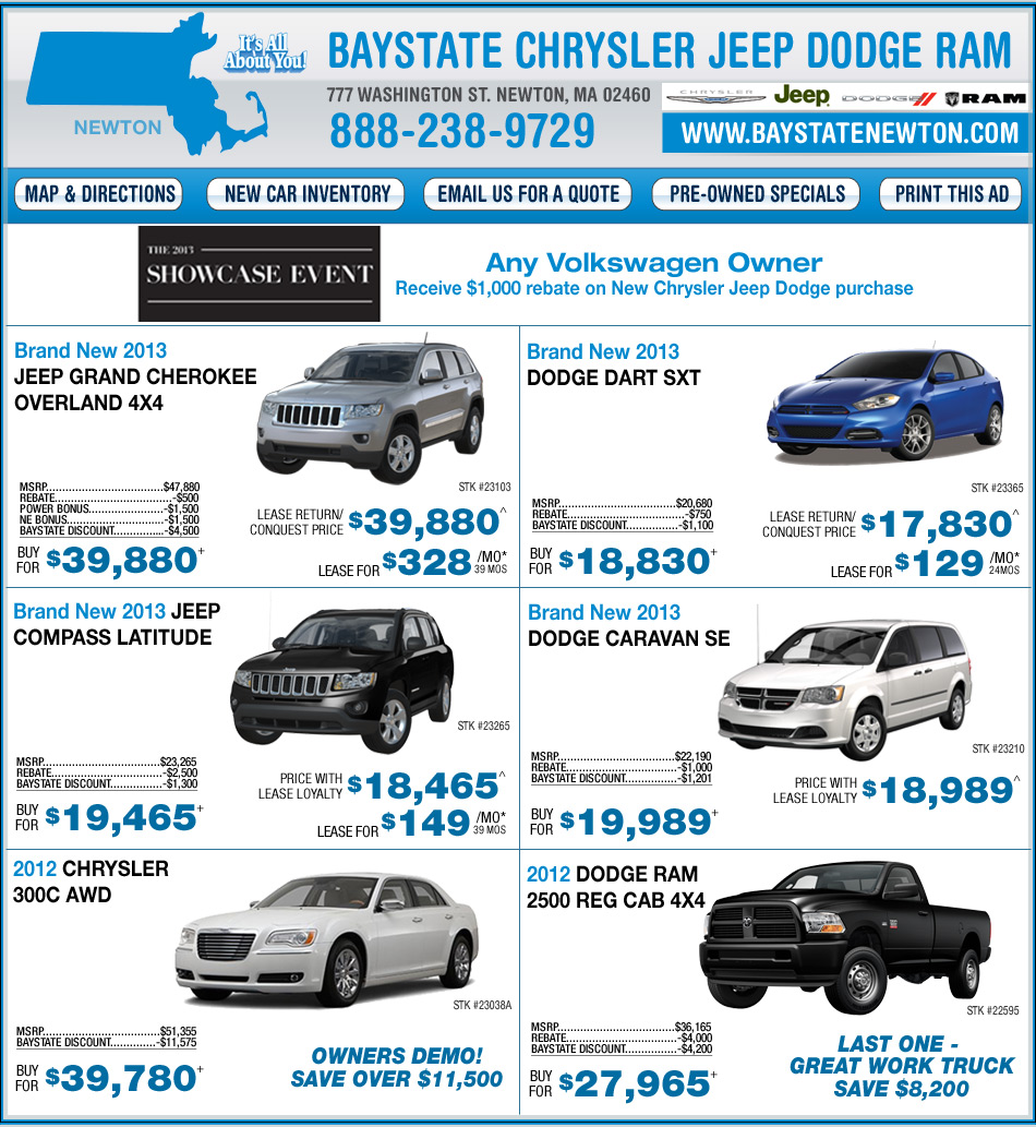 *Lease includes lease loyalty/conquest cash, $1,895 cash down, tax,title,reg,doc,1st payment and sticker extra. All leases 10,000 miles per year 39 months except Dart @ 24 months. Sale ends 4/30/13.