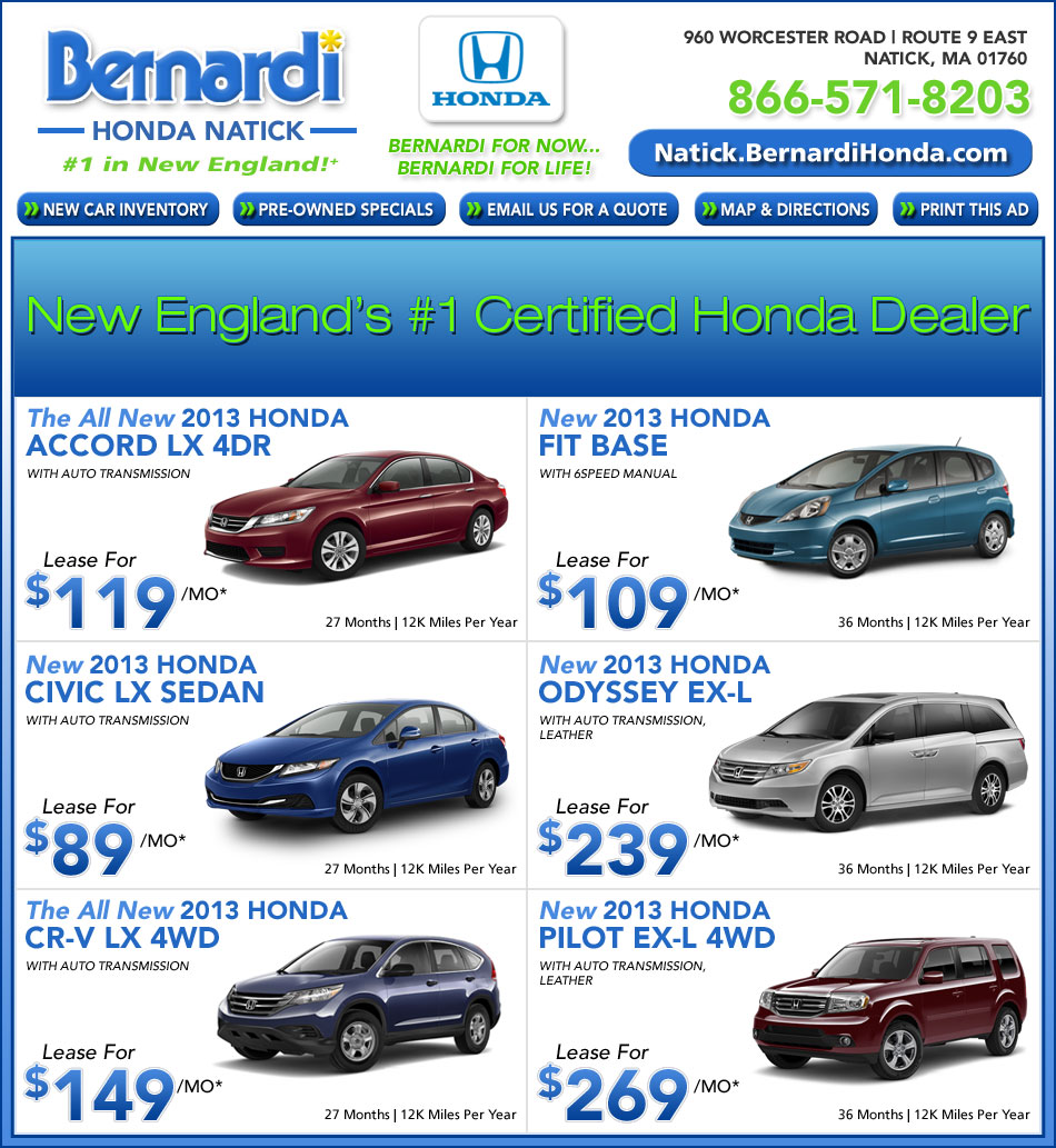 Bernardi Honda is the largest Honda dealer for certified pre-owned cars in all of New England according to AHM's 2007, 2008, 2009, 2010, 2011 and 2012 FieldLink National Report.