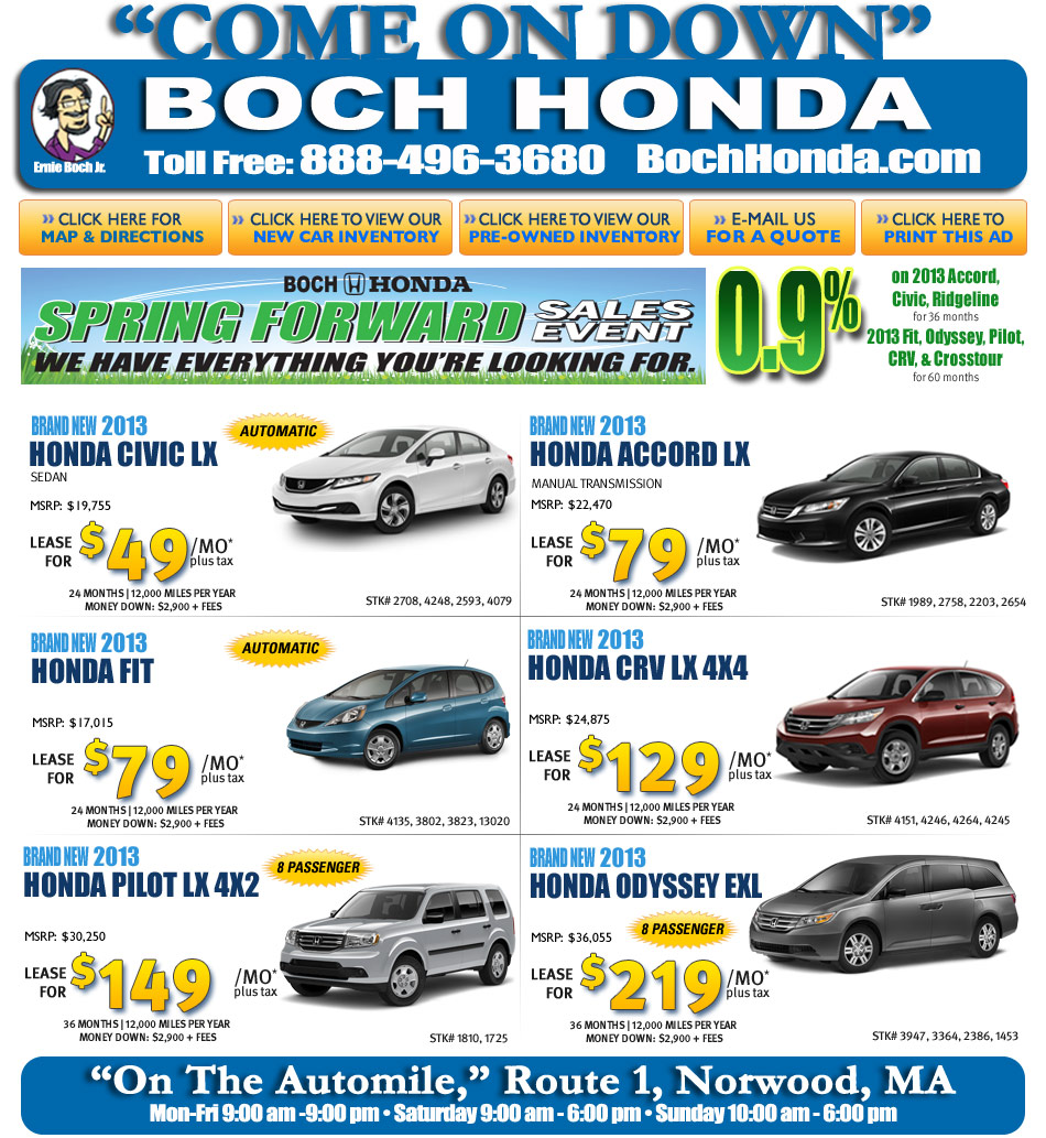 *Lease requires approved credit; based on 12,000 miles per year, .15 per mile excess; LEASE BASED ON $2,900 CASH OR TRADE DOWN. Security deposit waived. Dealer's Advertised Price is this amount plus $349 doc prep fee, sales tax, bank acquisition, title, and registration fees. Accord LX (Manual) residual: 66% & cap cost reduction of $19,500, Fit residual: 68%, & cap cost reduction of $15,500.Civic LX residual: 68% & cap cost reduction of $16,800. CR-V residual: 70% & cap cost reduction of $22,650. Odyssey EXL residual: 53% & cap cost reduction of $29,400. Pilot LX 4X4 residual: 55% & cap cost reduction of $31,500. CR-V LX 4X4 residual: 70% & cap cost reduction of $22,650 and Fit: residual 68% & cap cost reduction of $15,500. All rebates promotions and incentives to dealer. Must take same day delivery, prior sales excluded. Supplies are limited. Images are for illustration purposes only. Color and vehicle may vary. Offer ends 7/8/13.