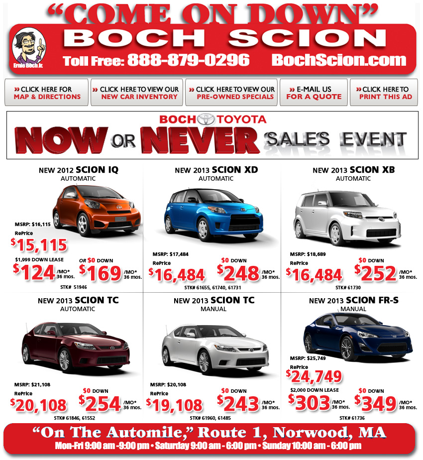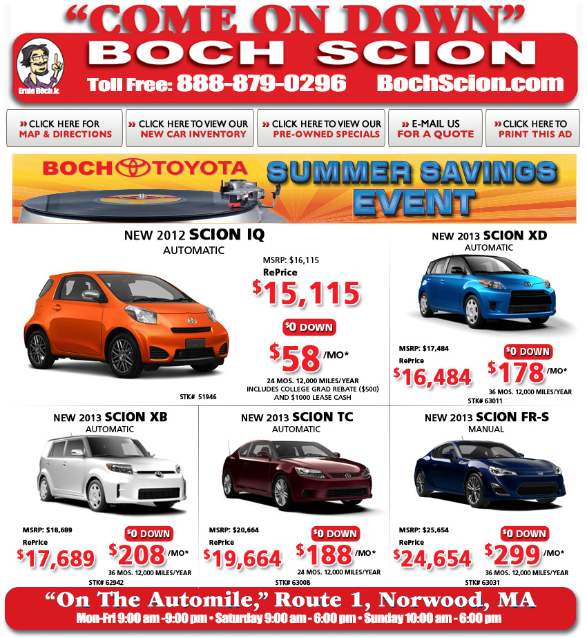 *Lease requires approved credit; based on 12,000 miles per year, .15 per mile excess; LEASE BASED ON $0 CASH OR TRADE DOWN plus tax and fees. Security deposit waived. Advertised price does not includes $349 doc prep fee, sales tax, bank acquisition, title, or registration fees. Scion IQ residual: $10,380, Scion TC residual: $13,216, TC (Manual) $12,546, Scion XD residual: $10,920, Scion iQ residual: $10,380, Scion FR-S residual: 16,660,Scion XB residual: $10,752. All rebates promotions and incentives to dealer. Must take same day delivery, prior sales excluded. Dealer's Advertised Price is this amount plus $349 doc prep fee. Price does not include sales tax, bank acquisition, title, and registration fees; price requires that customer qualify for recent college grad rebate and that all rebates, promotions and incentives go to dealer. Must take same day delivery, "prior sales excluded". Supplies are limited. Vehicles are for illustration purposes only. Sale ends 4/30/13.