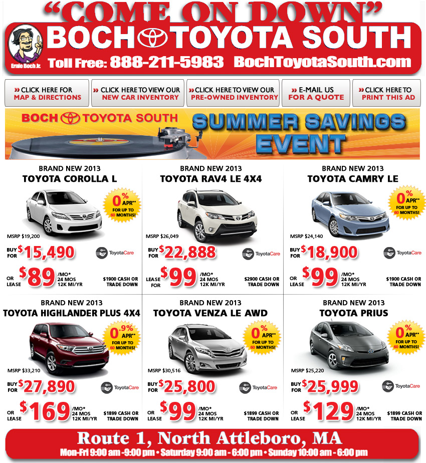 *Advertised price excludes $349 doc prep fee. Prices do not include tax, title or registration fees; price requires that customer qualify for recent college grad rebate and that all rebates, promotions and incentives go to dealer. Limited to vehicles indicated; valid only until date shown above, Must take same day delivery, prior sales excluded. Supplies are limited. Vehicles are for illustration purposes only. Lease and APR offers requires approved credit; based on 12,000 miles/year, .15/mile excess; Security deposit waived. Camry $109 x 24, 16,203 res., Corolla $89 x 24, 11,942 res., Venza $179 x 24, $20,510 res. Rav4 $109 x 24, $18,625 res., Sienna $249 x 24, $20,617 res., Highlander $179 x 23,247 res Based on $1,900 cash or trade down, Venza & Sienna based on $999, Sale ends 5/31/13.