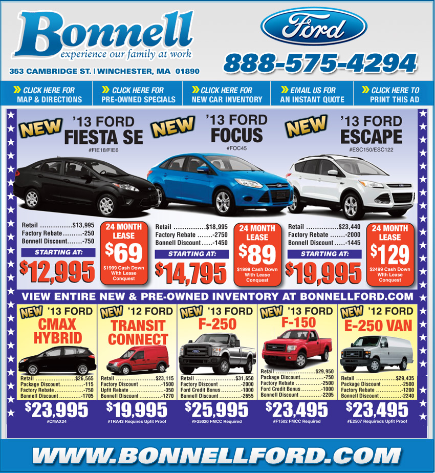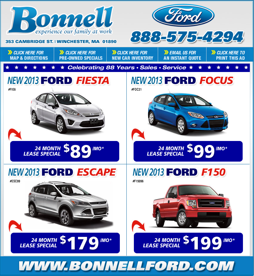 | *Tax, title, plates and dealer doc fee additional. Lease had has cash down of $1999 (Fiesta/Focus), $2499 Escape, $645 bank acquisition fee, doc, tax, plates & first payment due at signing. Lease has 10,500 miles per year, 21,000 total with .20 cents extra per mile. Must have non-Ford lease in household. Must take retail delivery from stock using dealer financing. Prior sales excluded. Ends April 30, 2013. |