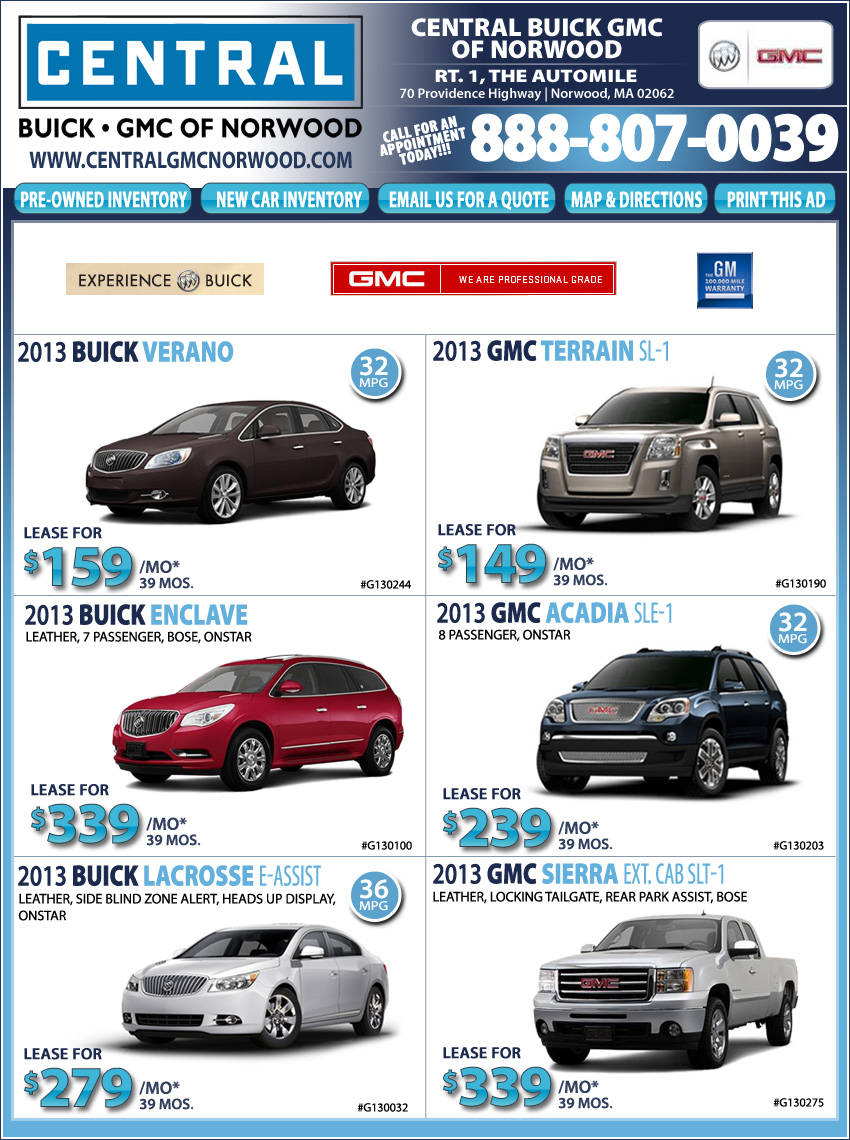 39 mos., 10k m/yr, $2,499.00 due at signing. Includes Lease Conquest. Extra charges may apply at lease end. Lease Conquest: Current '99 or newer non-GM lessees or household members are eligible. Termination not required. **Trade Assist requires trade of '99 or newer vehicle. See dealer for details & eligible vehicles. Transactions must be completed at time of sale. Prior sales excluded. Sale ends 5/31/13.