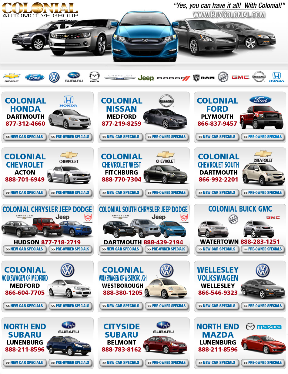 NorthEnd Mazda Pre-Owned Colonial Honda of Dartmouth CitySide Subaru Colonial Chevrolet Colonial Chrysler Jeep Dodge Colonial Ford Colonial Nissan Colonial Pontiac Buick GMC Colonial South Chrysler Jeep Dodge Colonial South Chrysler Jeep Dodge Colonial South Chevrolet Colonial Volkswagen of Medford Colonial Volkswagen of Westborough Colonial West Chevrolet NorthEnd Mazda NorthEnd Subaru Wellesley Volkswagen Visit www.BuyColonial.com! Honda of Dartmouth Pre-Owned CitySide Subaru Pre-Owned Colonial Chevrolet Pre-Owned Colonial Chrysler Jeep Dodge Pre-Owned Colonial Ford Pre-Owned Colonial Nissan Pre-Owned Colonial Pontiac Buick GMC Pre-Owned Colonial South Chevrolet Pre-Owned Colonial Volkswagen of Medford Pre-Owned Colonial Volkswagen of Westborough Pre-Owned Colonial West Chevrolet Pre-Owned NorthEnd Subaru Pre-Owned Wellesley Volkswagen Pre-Owned