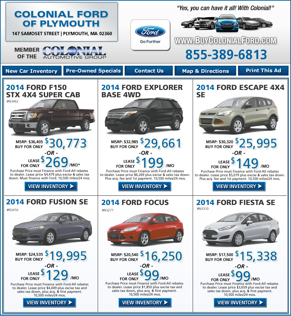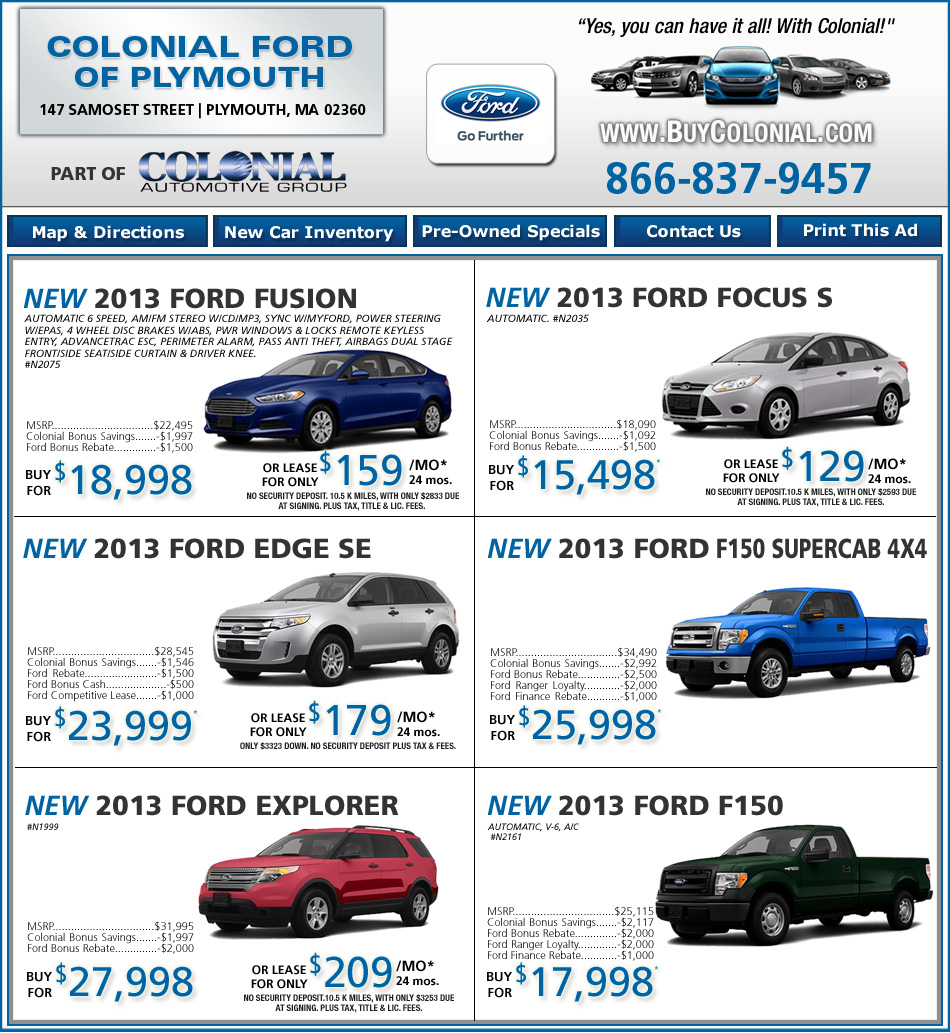 | *All manufacturer rebates to dealer, must qualify. See dealer for details, pictures for illustration only. Subject to factory extension of all manufacturer rebates to dealer and incentives. 24 month lease, 10500 miles per year, plus lease inception fees, security deposit not required. See dealer for details. Lease payments do not include sales or excise tax. **All Ford rebates to dealer, must qualify. See dealer for details. Sale ends 6/30/13. Pictures for illustration only. |