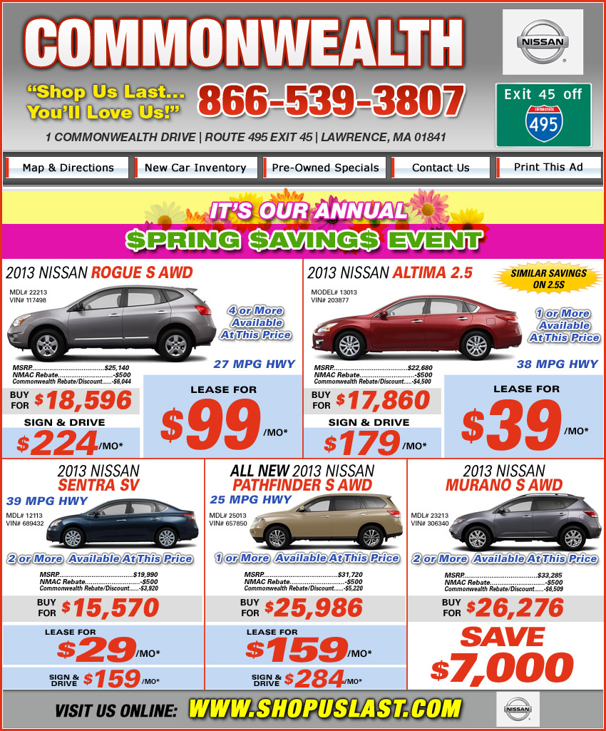 | *Altima 24 month lease, Sentra "Lease For" 24 months, Sentra Sign and Drive & Pathfinder are 36 month Lease. Rogue is a 39 month Lease. All lease are 12K per year". Sign & Drive tax and fees are additional. "Lease for" includes $2995, tax, fees and first payment down. All leases and prices include all applicable rebates. Sales end 5/31/13. |