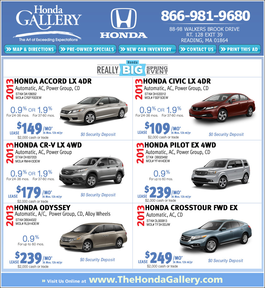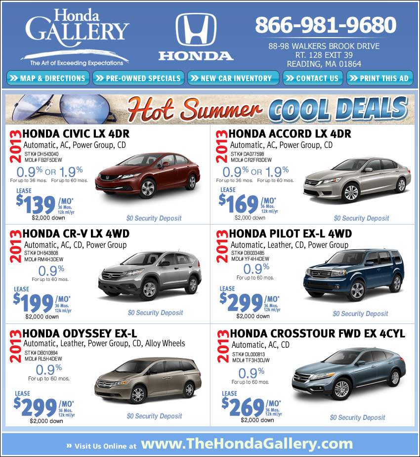*Leases are 36 months, 12k mi/yr. $2,000 down. Tax, title, reg., doc and acquisition fees not included. Subject to credit approval. Prices include incentives to dealer & are in lieu of special financing. See dealer for details. Prior sales excluded. Offer ends 6/30/13.