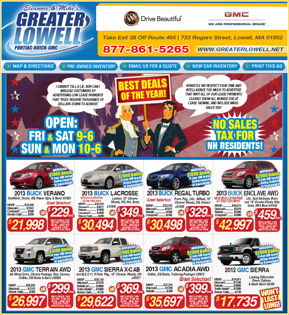 *Must qualify. Must own 1999 or newer GM to qualify for Conquest and must trade in 1999 or newer vehicle for Trade Bonus. Leases are based on 10K mi/yr., 39 months. All rebates to dealer in lieu of low APR and low apr/rebate combo including Loyalty & Conquest Rebates. Must finance through Ally bank. Vehicles must be paid for in full, same day. Prior sales & factory orders excluded. Ends 2-28-13.