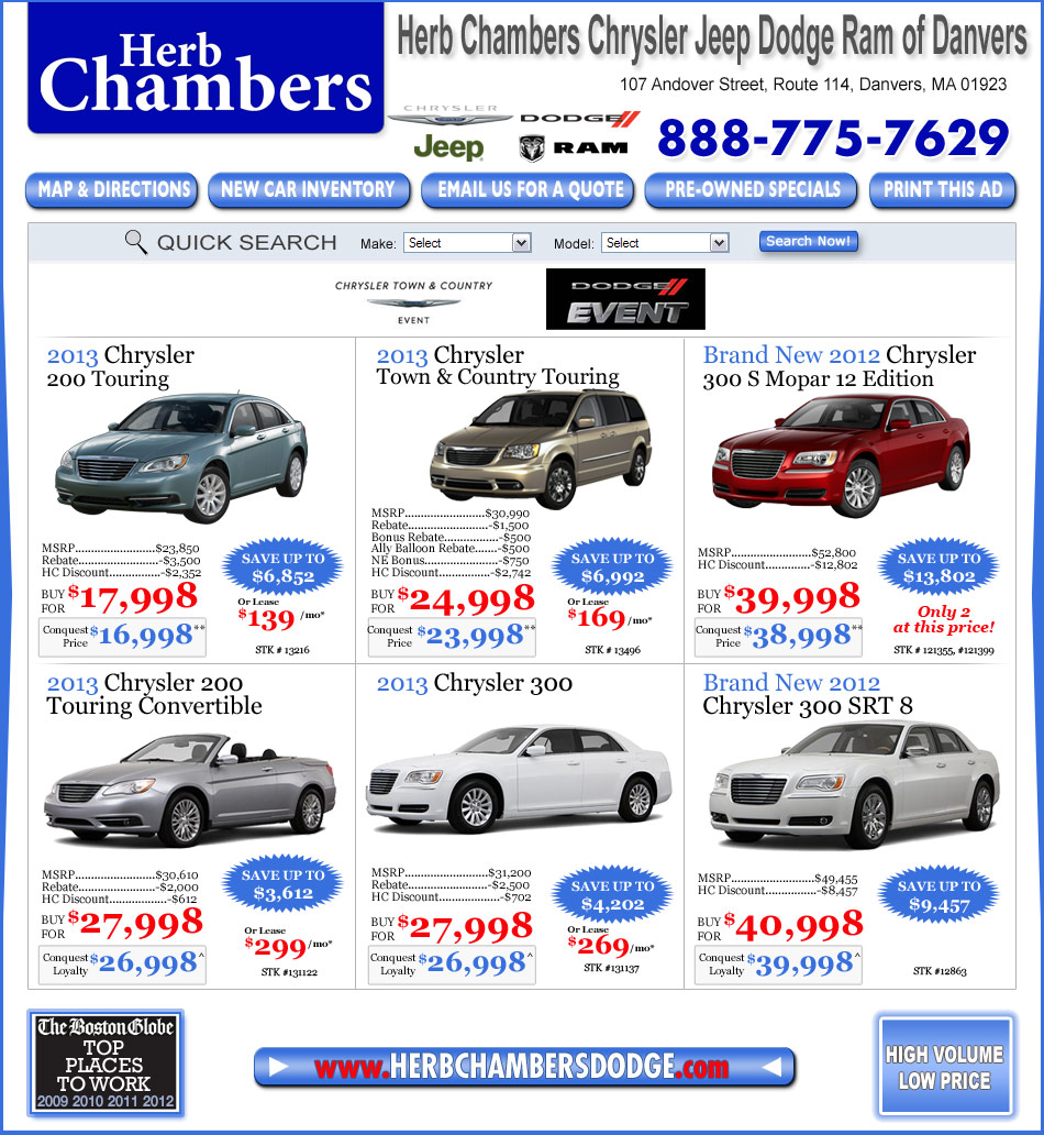 *All leases are for 36 months (Dart, Town & Country, Grand Cherokee and Grand Caravan are 24 months), 10K miles per year with approved credit plus $2,899 down, bank fee, $289 documentation fee, 1st payment, tax, registration fee and zero security deposit required. Prior sales excluded. Must also qualify for Lease Loyalty rebate or Conquest lease rebate. **Conquest Lease rebate must have a non-Chrysler lease registration. +Lease loyalty rebate must have a current Chrysler lease expiring by January 3, 2014. Ally Balloon rebate must finance a balloon contract with Ally Bank with approved credit. Must take same day delivery. **Trade rebate requires the trade in of a registered vehicle to qualify. +Commercial bonus rebate of $1,000 on RAM Models must have a business. Photos are for illustration purposes only. See dealer for details. Offers expire 7/5/13.