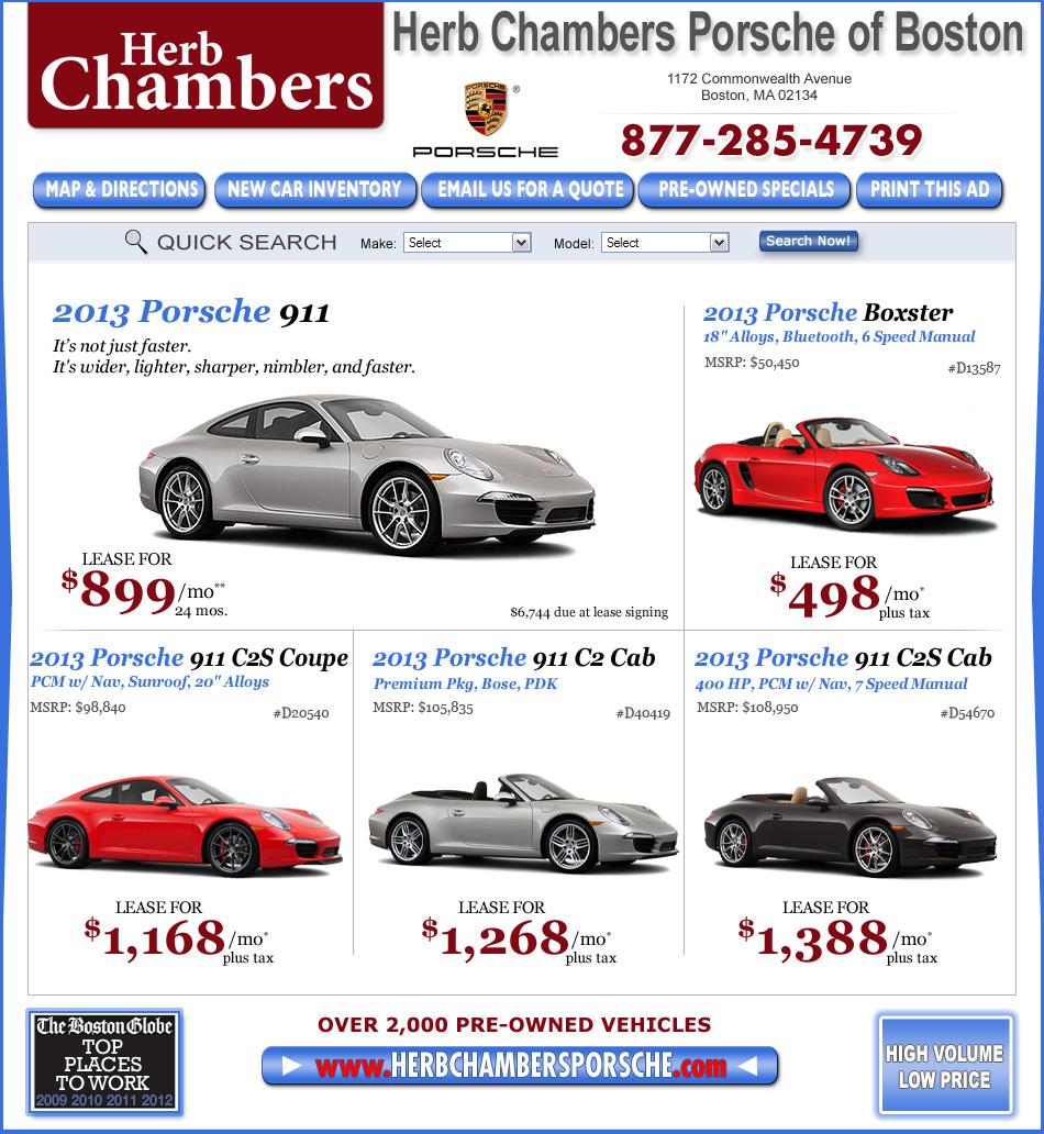 *All leases are 27 months, 5,000 miles per year (except 911: 24 months/15,000 miles per year). $5,000 plus up fronts due at inception, pending PFS approval. ***Actual lease price determined by your Authorized Porsche Dealer, your payments may vary. Closed-end lease offered to qualified lessees with approved credit by Porsche Financial Services through participating U.S dealers. Must take delivery by 6/30/13. Estimated payments based upon MSRP of $94,975 (includes destination charge) for a Model Year 2013 911 C2 with the following options: Metallic Paint, Bose Audio Package, Premium Package, Heated Front Seats, 20-inch Carrera S wheels, Sport Chrono Package, and Sunroof. Price excludes title, taxes, registration, license fees, insurance, and maintenance. Lease payments of $889.26 for 24 months= $21,582.24 based on capitalized cost of $85,300 (requires dealer contribution which could affect price). Total due at signing $6,744.26 (first month's payment, acquisition fee of $895, and a capitalized cost reduction of $4,950). No security deposit required. At lease end, lessee pays excess wear and tear, $0.30/mile over 30,000 miles and $350 termination fee. Purchase option at lease end $71,231.25 plus taxes. Specific vehicles and options are subject to availability and your price may vary. For additional information see your participating Authorized Porsche Dealer or visit Porsche.com/usa. Sale ends 7/31/13.