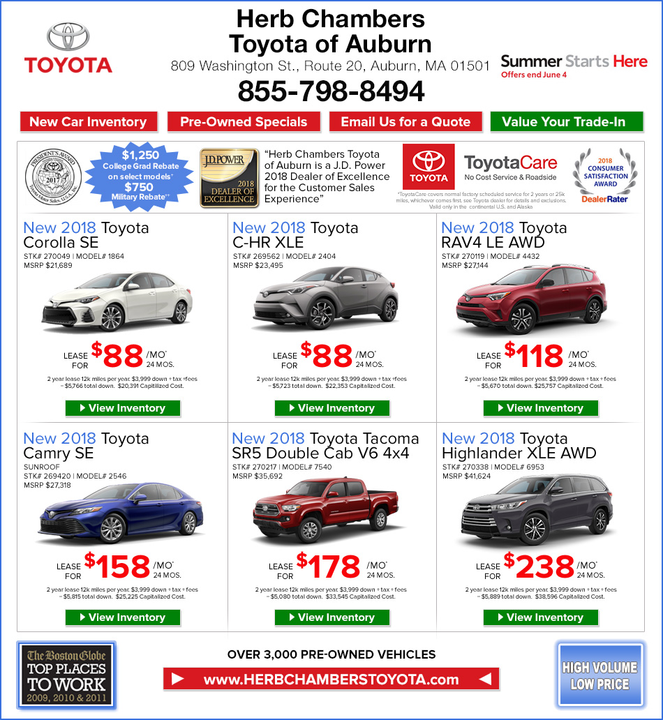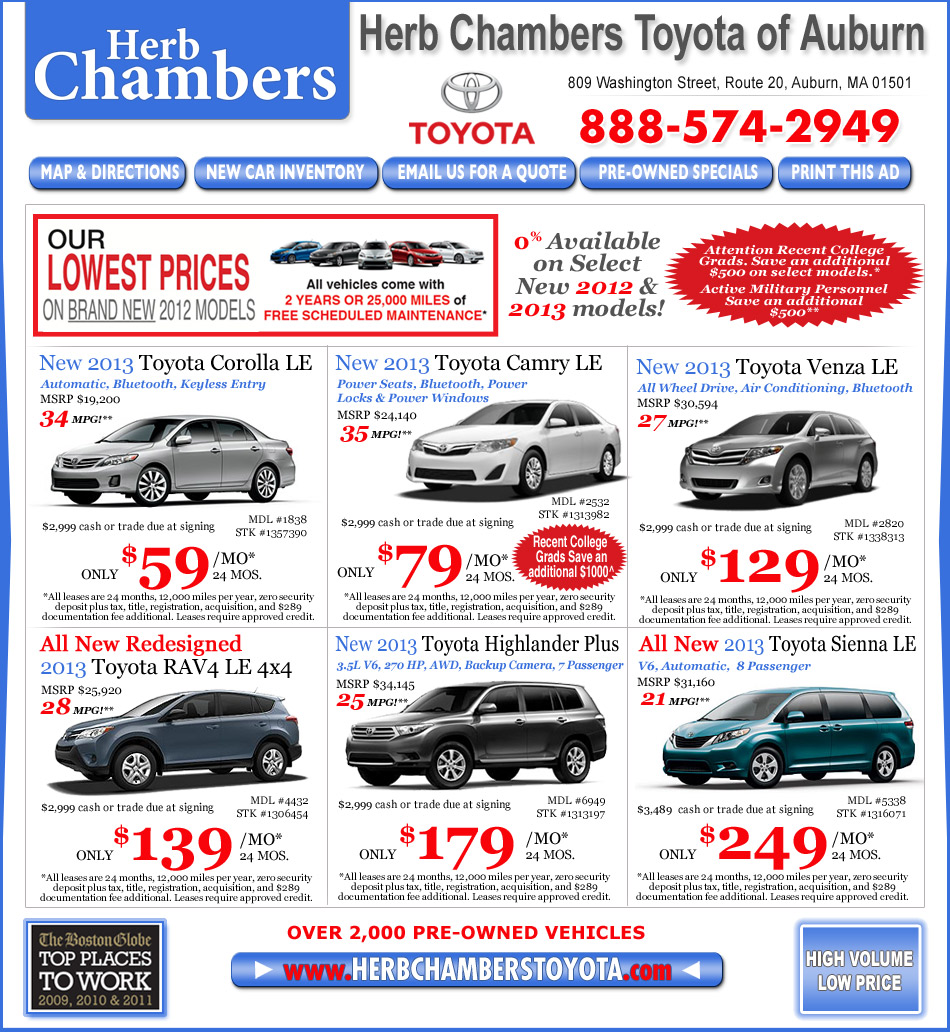 *All leases are 24 months, 12,000 miles per year, zero security deposit plus tax, title, registration,acquisition, and $289 documentation fee additional. Leases require approvedcredit. †To qualify for the $500 College Rebate, you must show proof of graduation in the last two years or in the upcoming next six months. Must finance with TFS. +Recent College Grad Rebate: 6 months prior to or 2 yearsafter graduation, proof of employment, no derogatory credit. ^$1000 Collegecredit available on gas model Camrys only. Hybrids excluded. ++Military Rebate: Must be active duty. *Covers normal factory scheduled service. Plan is 2 years or 25K miles, whichever comes first. The new vehicle cannot be part of a rental or commercial fleet, or a livery/taxi vehicle. See participating dealer for complete plan details. Valid only in the continental United States and Alaska. Roadside assistance does not include parts and fluids. Prius Plug-in Hybrid comes with an extra year of roadside assistance, for a total of three (3) years from date of purchase. Sale ends 7/1/13.