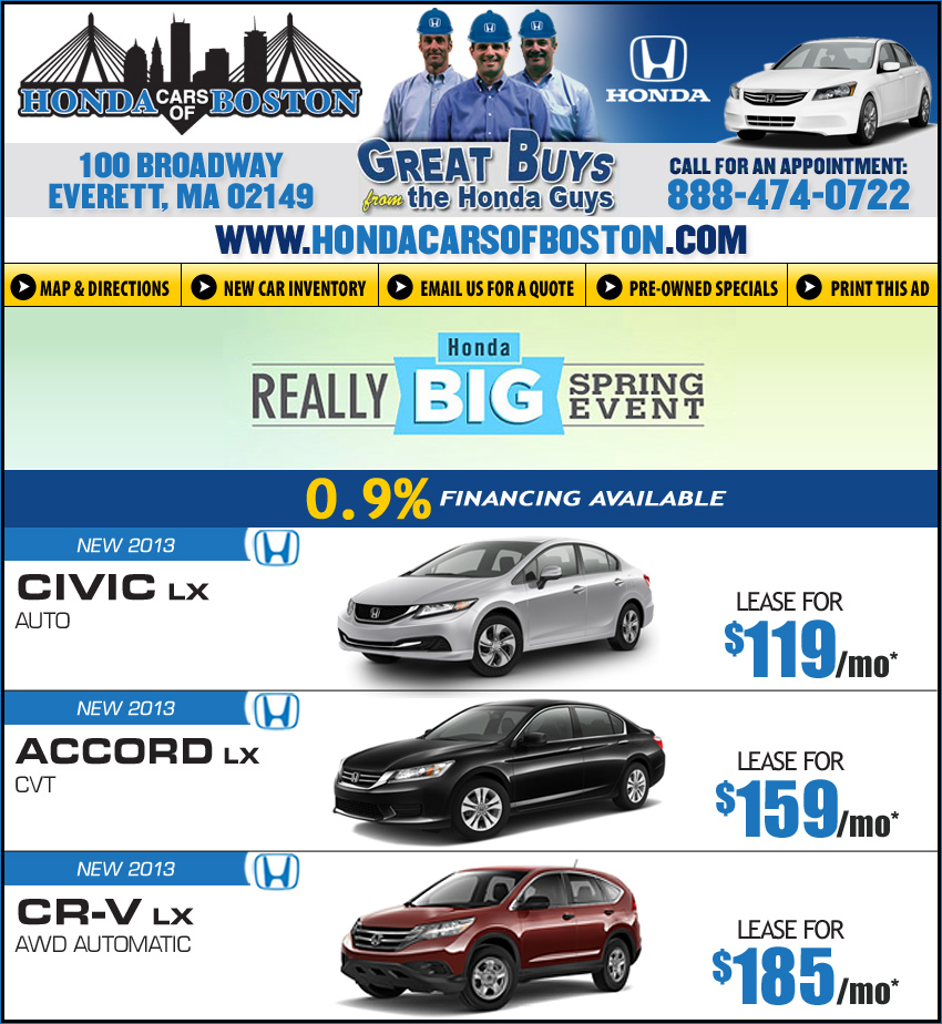 *Closed end lease for 24 months with $2,999 cap cost reduction available to customers who qualify for the AHFC Super Preferred credit tier, other rates/tiers are available under this offer. $2,999 due at signing, plus tax, fees, acq. fee, first payment. Lessee responsible for maintenance, excess wear & tear, and $0.15/mi over 12,000 for vehicles with MSRP less than 30,000 but for vehicles with MSRP of $30,000 or more, mileage is $0.20/mi over 12,000 miles per year. **Up to 60 months on Fit, Odyssey, Pilot and CR-V. Up to 36 months. All annual percentage rate financing available with approved credit. See dealer for details. Sale ends 6/30/13.