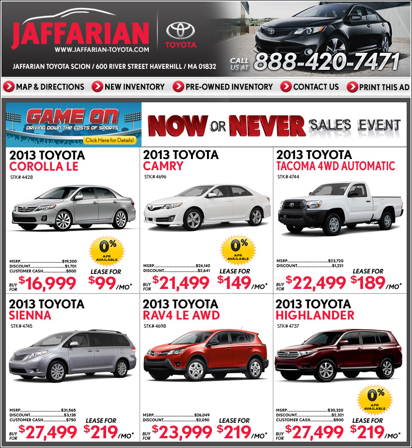 *All leases $2,999 cash capital reduction, 36 months, 12,000 miles per year. Based on tier 1 plus credit. Tax, title, registration, and documentation fee of $229.00 additional. Offers expire 4/30/13.