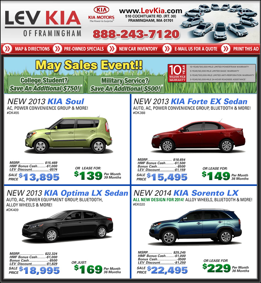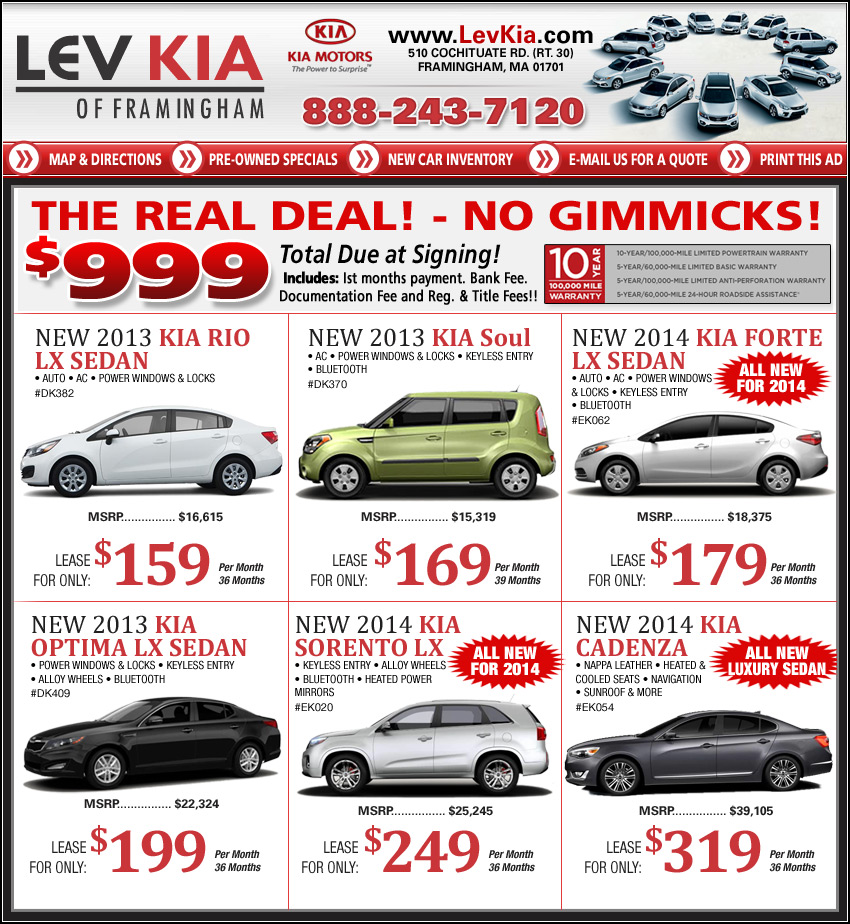 *Payments are for a 12,000 mile per year lease. The TOTAL due at signing is only $999 which INCLUDES your FIRST MONTHS PAYMENT, BANK FEE, DOCUMENT FEE and standard MA REGISTRATION FEES! MA sales tax of 6.25% is not included the payments. Tier 1-4 credit approval is required. Requires qualification for the Competitive Brand or Kia Loyalty programs. $500 Military Service and $750 Recent College Student programs are NOT INCLUDED but are available to qualified individuals and will lower your payment. Sale ends 6/30/13.