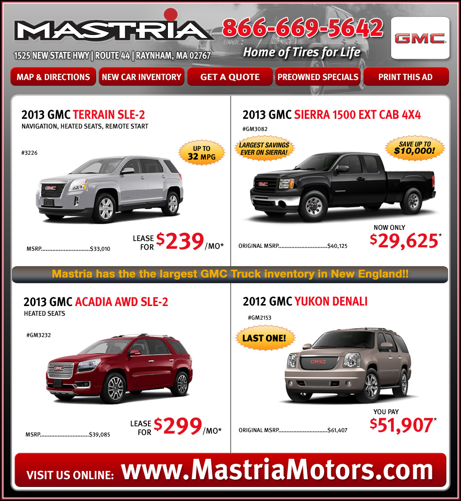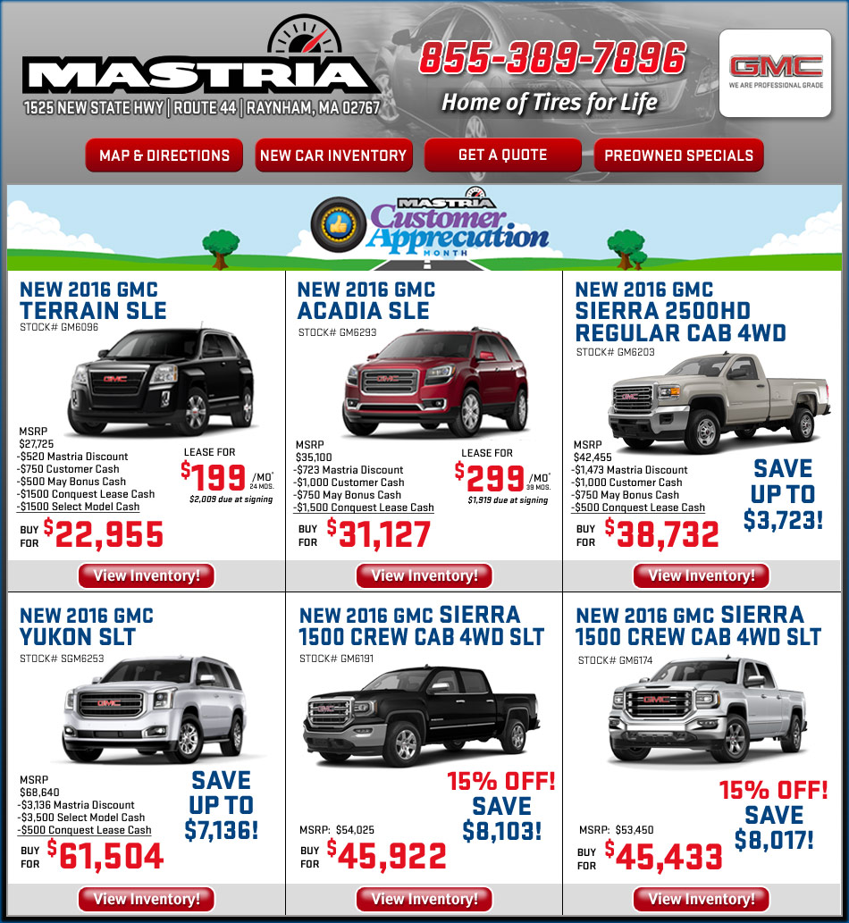 Mastria GMC Truck in Raynham, MA has long been known by Massachusetts auto buyers as the best source for new and used GMC models. Check out our special deals and discounts on GMC Acadia, Sierra, Terrain, Savana, Canyon and Yukon models. View Other Mastria Specials