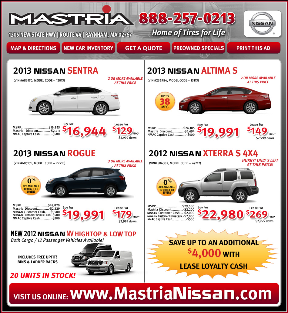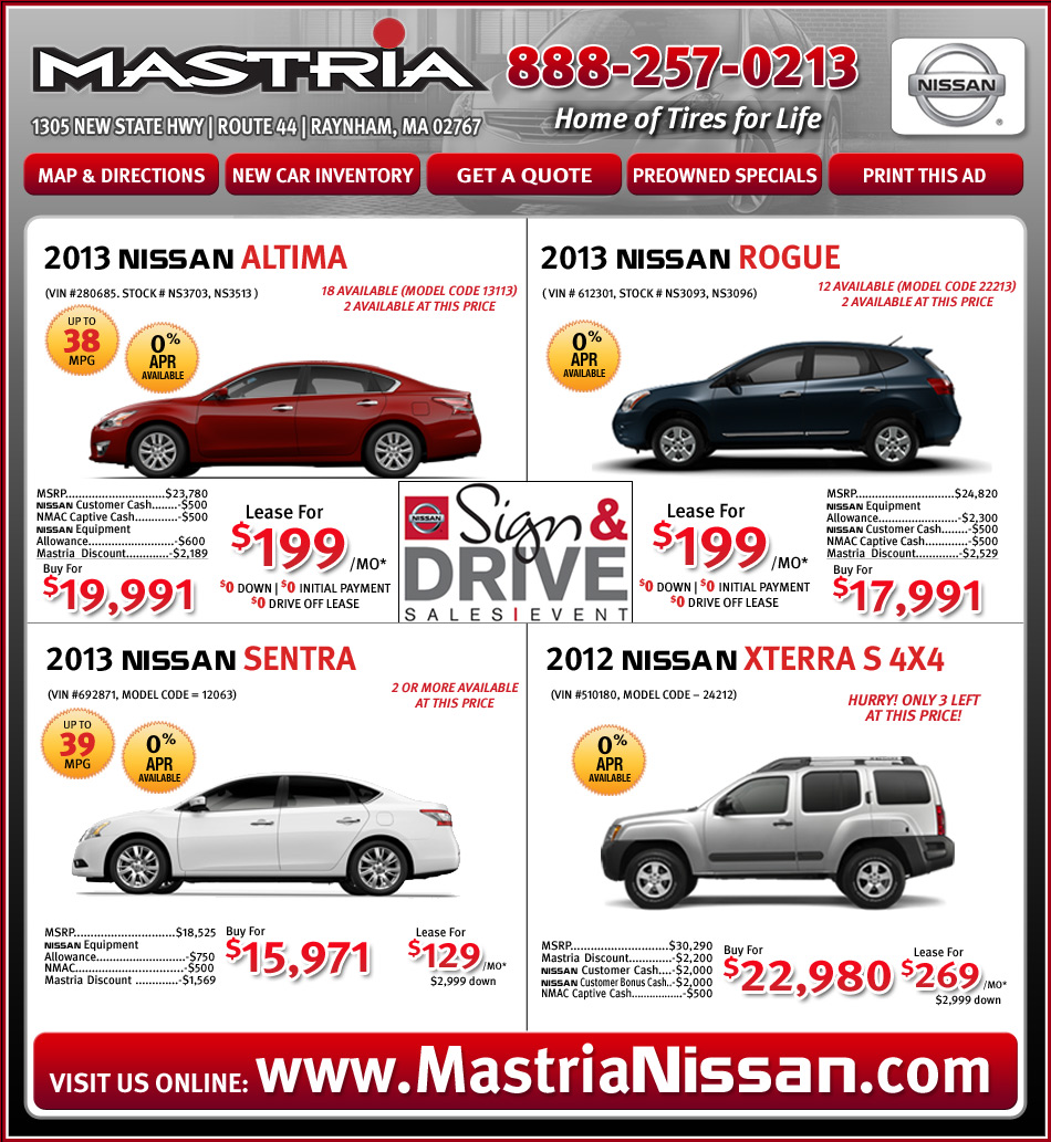 Mastria Nissan in Raynham, MA is a top destination for new and used Nissans for sale. View our vast selection of Nissan Altima, Frontier, Maxima, Murano, Sentra, Pathfinder, Rogue, Xterra and Nissan NV models in Massachusetts. View Other Mastria Specials