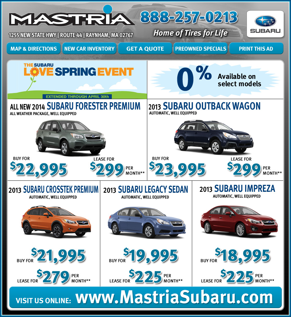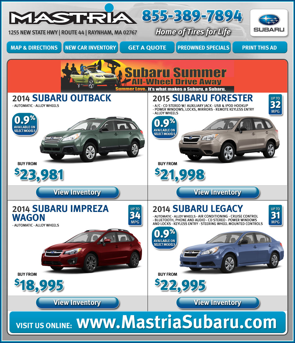 Mastria Subaru in Raynham, MA is a top destination for new and used Subarus for sale. View our vast selection of Subaru Impreza, Forester, Legacy, Outback and Tribeca models in Massachusetts. View Other Mastria Specials