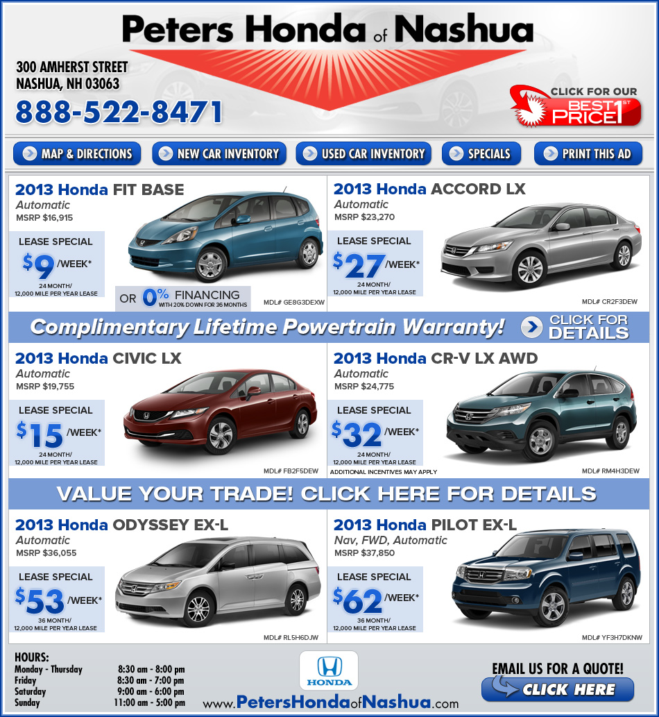 *All leases based on approved credit. $2,999 cash or trade equity down. Plus $595 bank fee, 1st months payment, $370 Doc Fee, $27 Reg. Coupon not valid with any other offer. Must present coupon at time of purchase. Limit one coupon per vehicle purchased. Coupon does not apply to prior purchases. Other restrictions may apply. Void where prohibited. Offer expires 06/30/2013.