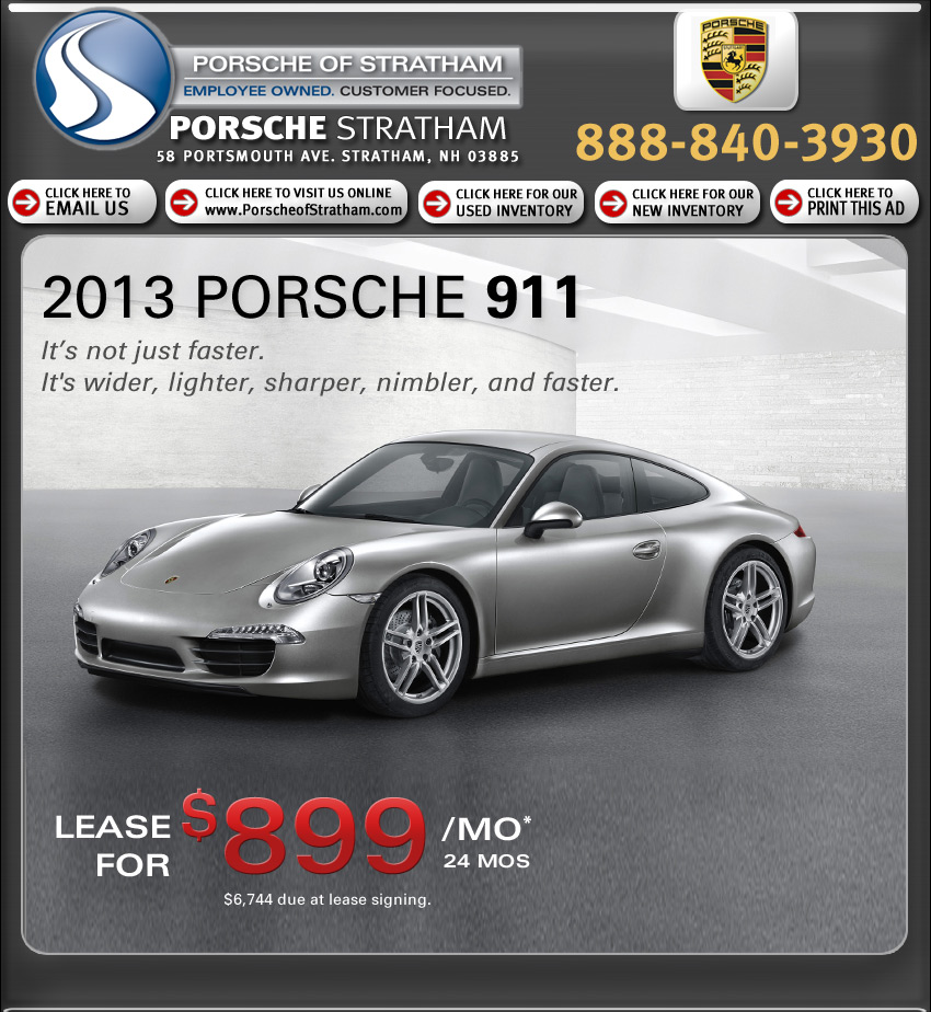 | *Actual lease price determined by your Authorized Porsche Dealer, your payments may vary. Closed-end lease offered to qualified lessees with approved credit by Porsche Financial Services through participating U.S dealers. Must take delivery by 4/1/2013. Estimated payments based upon MSRP of $94,975 (includes destination charge) for a Model Year 2013 911 C2 with the following options: Metallic Paint, Bose Audio Package, Premium Package, Heated Front Seats, 20-inch Carrera S wheels, Sport Chrono Package, and Sunroof. Price excludes title, taxes, registration, license fees, insurance, and maintenance. Lease payments of $889.26 for 24 months= $21,582.24 based on capitalized cost of $85,300 (requires dealer contribution which could affect price). Total due at signing $6,744.26 (first month's payment, acquisition fee of $895, and a capitalized cost reduction of $4,950). No security deposit required. At lease end, lessee pays excess wear and tear, $0.30/mile over 30,000 miles and $350 termination fee. Purchase option at lease end $71,231.25 plus taxes. Specific vehicles and options are subject to availability and your price may vary. For additional information see your participating Authorized Porsche Dealer or visit Porsche.com/usa. Sale ends 4/1/13. |