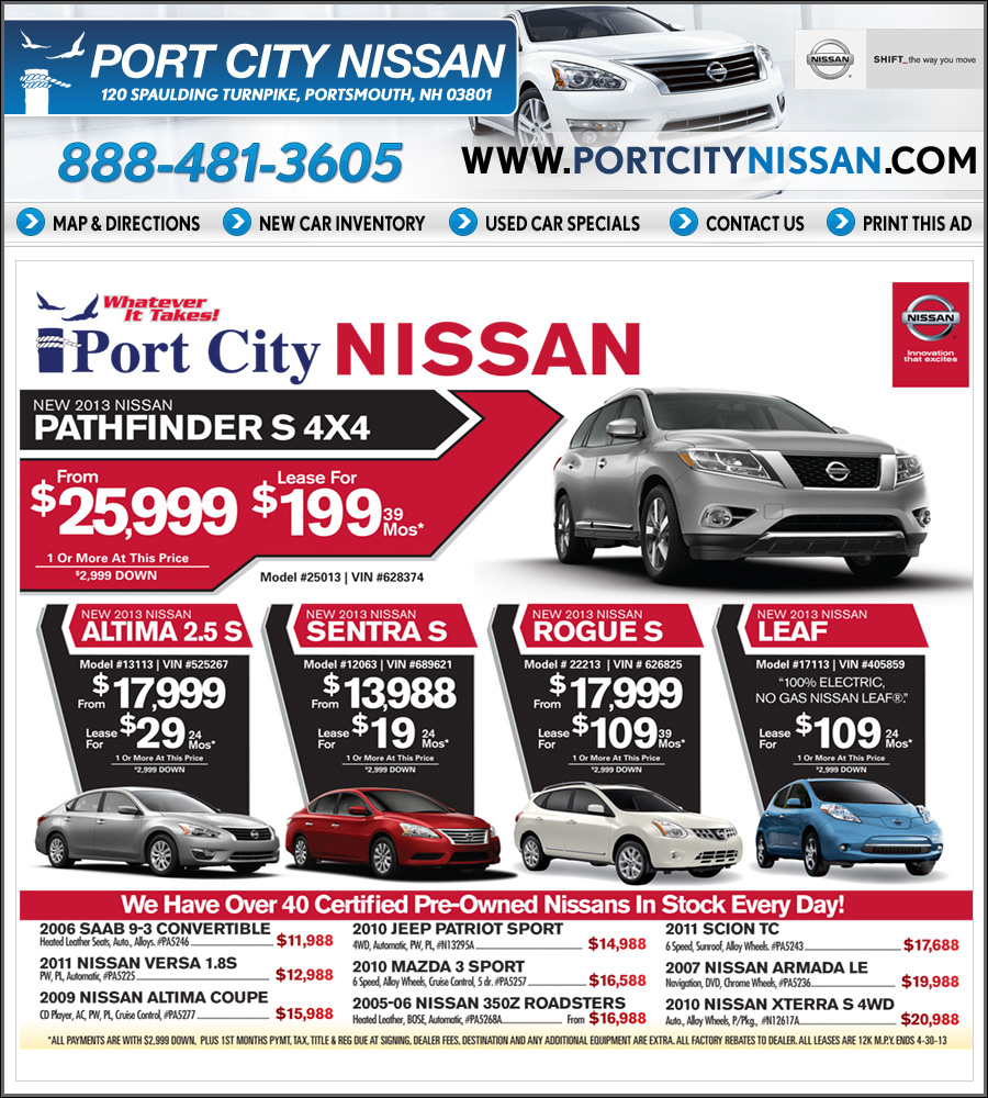 *ALL PAYMENTS ARE WITH $2,999 DOWN, PLUS 1ST MONTHS PYMT DUE AT SIGNING, DEALER FEES, DESTINATION AND ANY ADDITIONAL EQUIPMENT ARE EXTRA. ALL FACTORY REBATES TO DEALER. ALL LEASES ARE 12K M.P.Y. ENDS 4-30-13.