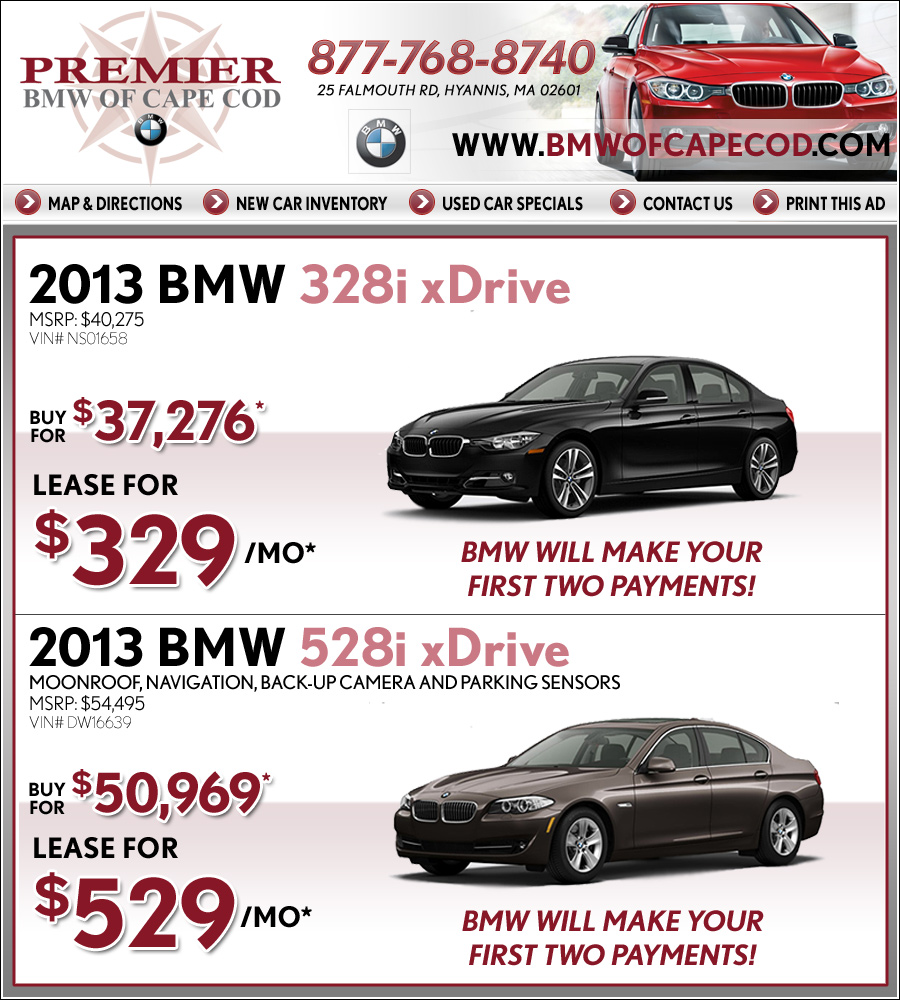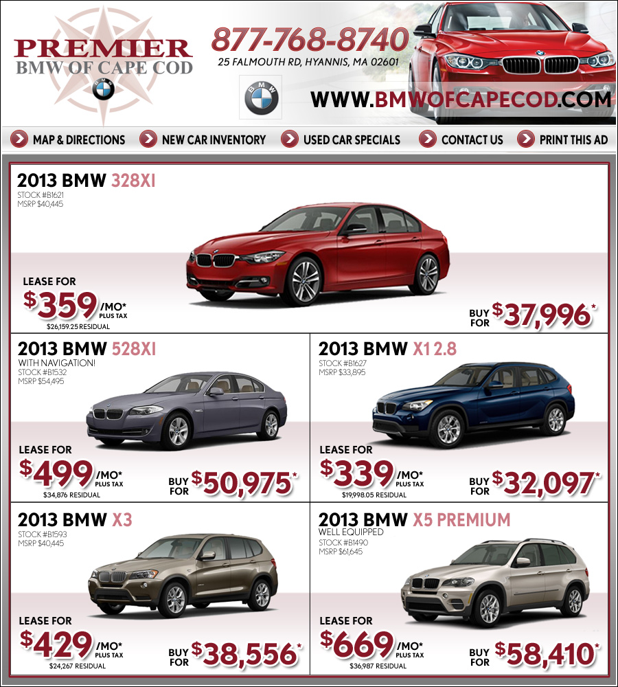 *36 Months, 10,000 miles per year, $2,499 down plus drives. On Approved 700+ Credit. Vehicle may need to be ordered. Excludes tax, title, license, registration and BMW Acq. fees. Sale price requires financing through BMW FS if client decides to purchase the BMW with a traditional loan. Program available to qualified customers and not everyone will qualify. Subject to credit approval. See participating dealer for details. Lessee must cover insurance and all items not covered under the BMW Maintenance Program. At lease end, lessee will be liable for disposition fee ($350.00), any excess wear and use as set forth in the lease agreement and excess mileage charges of $0.20 per mile. Purchase option at lease end excludes taxes. Lessee acquires no ownership interest unless purchase option is exercised. Ultimate Service covers all factory recommended maintenance on all new vehicles, as determined by the Service Level Indicator, for 4 years or 50,000 miles, whichever comes first. Exclusions from coverage: gasoline, gasoline additives, windshield washer additives, tires, wheels, wheel alignment, tire balancing and rotation. All work must be performed by an authorized BMW center. See the Service and Warranty information booklet for more details and specific terms, conditions and limitations. Sale ends 5/31/13.