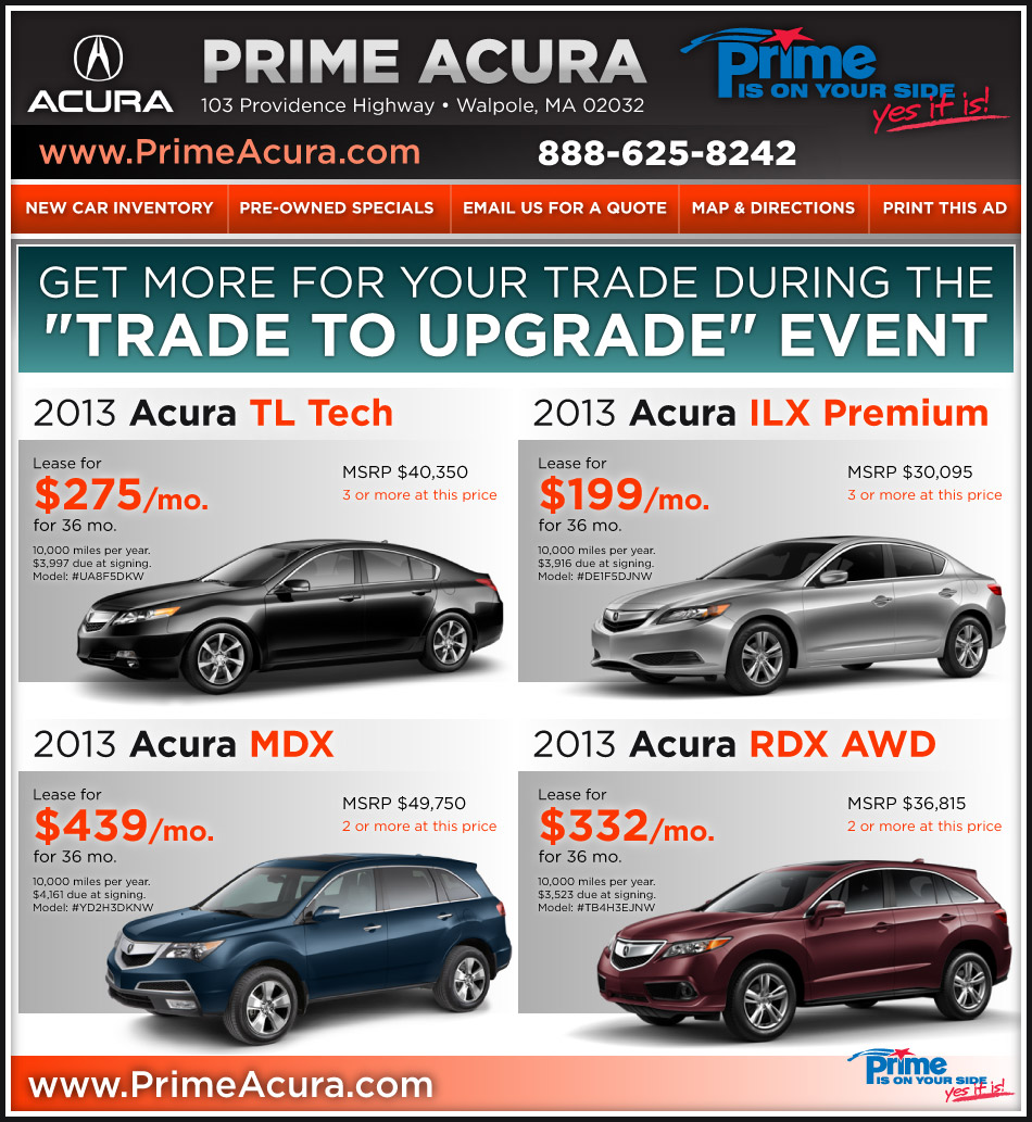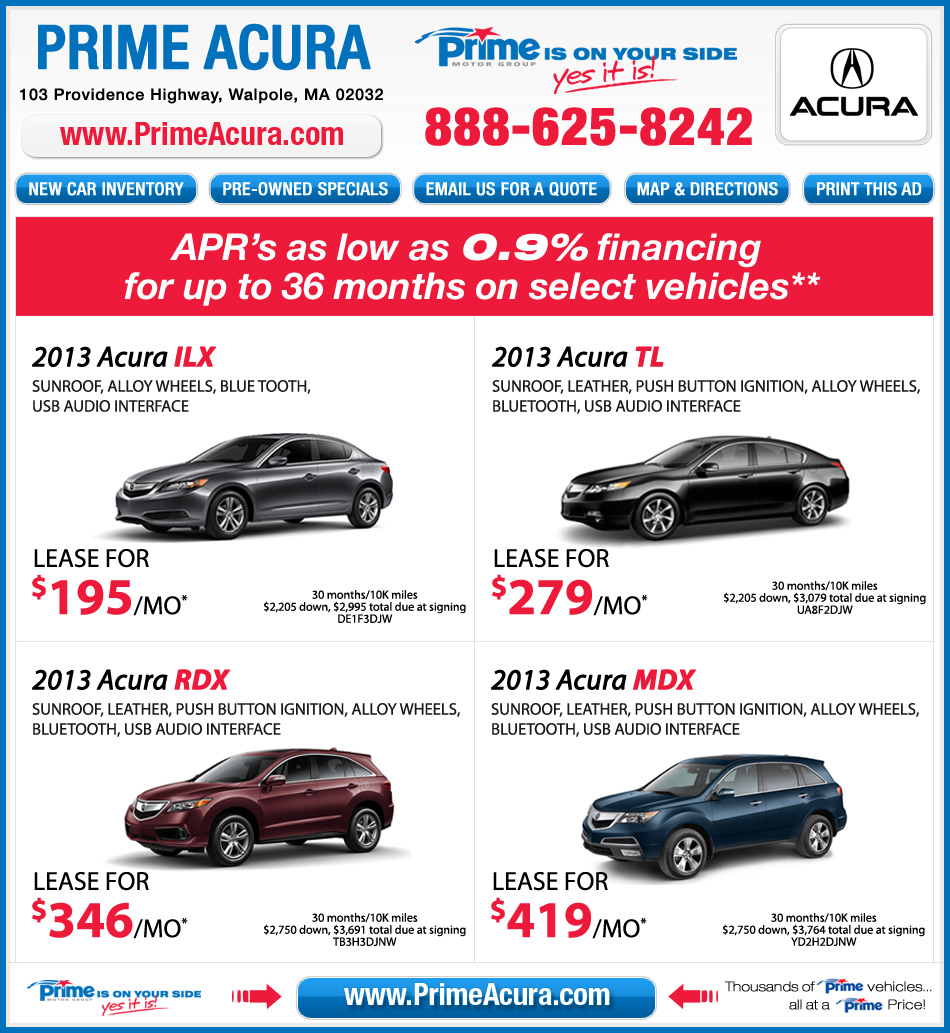 *All leases are on approved credit from Acura Financial Services with all applicable rebates to dealer. Tax, title, registration and doc fee extra. **0.9% for 36 months on 2013 Acura TL, ILX and RDX with approved credit. The Acura Loyalty Reward provides current Acura owners/lessees Or The Acura Competitor Conquest Offer provides select competitive current owners/lessees $1,500 towards Down Payment or Cap Cost Reduction, with the lease or purchase of a 2013 TL through Acura Financial Services (AFS). See your Acura dealer for complete details. Ends 6/30/13.