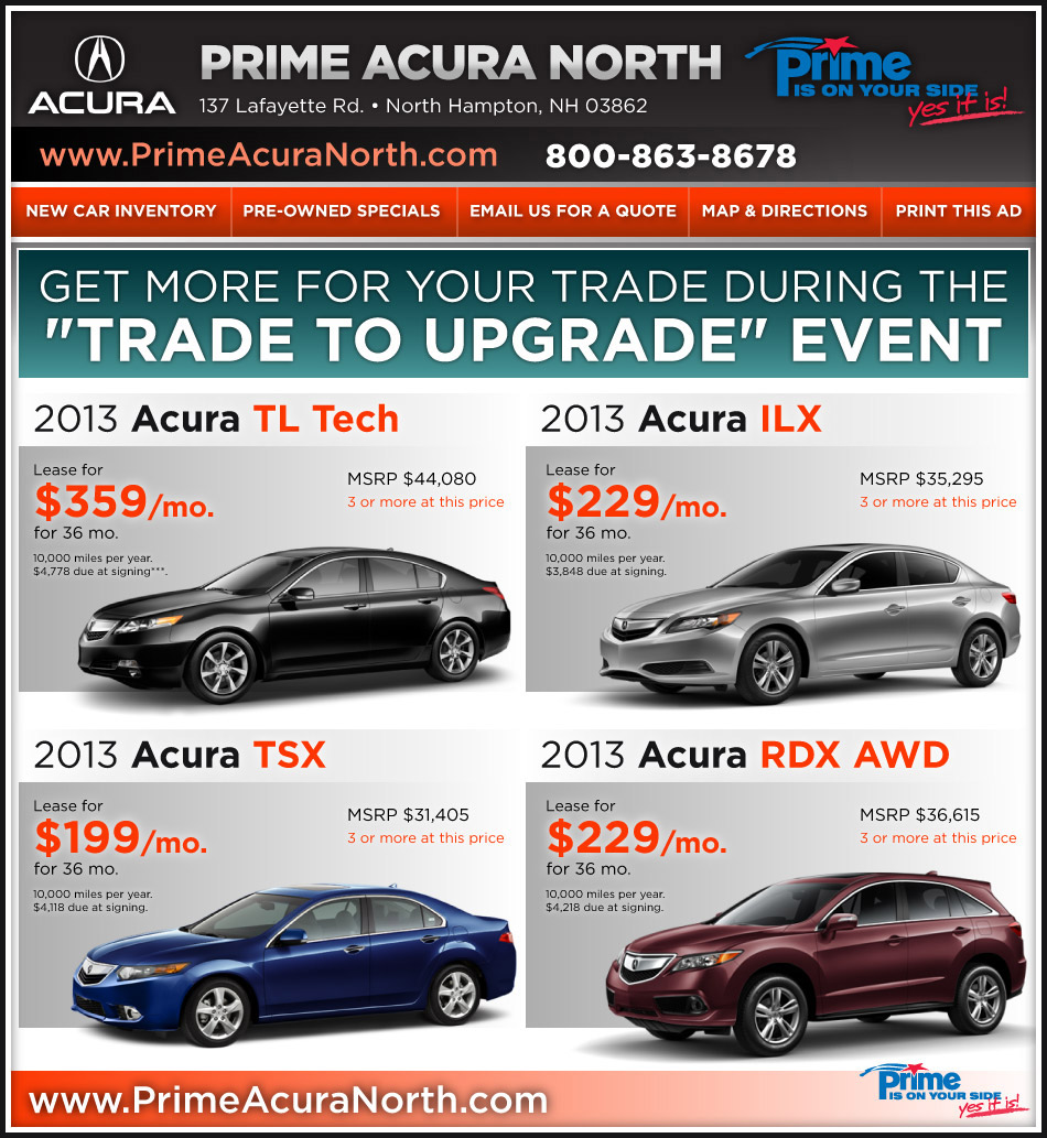 *All leases are on approved credit from Acura Financial Services with all applicable rebates to dealer. Tax, title, registration and doc fee extra. ***13 TL SH-AWD Tech down payment includes $1,500 Loyalty Reward or Conquest Offer for qualified buyers on approved credit from Acura Financial Services. [1]Based on 2013 EPA mileage ratings. Use for comparison purposes only. Your actual mileage will vary depending on how you drive and maintain your vehicle. Expires 6/30/13.