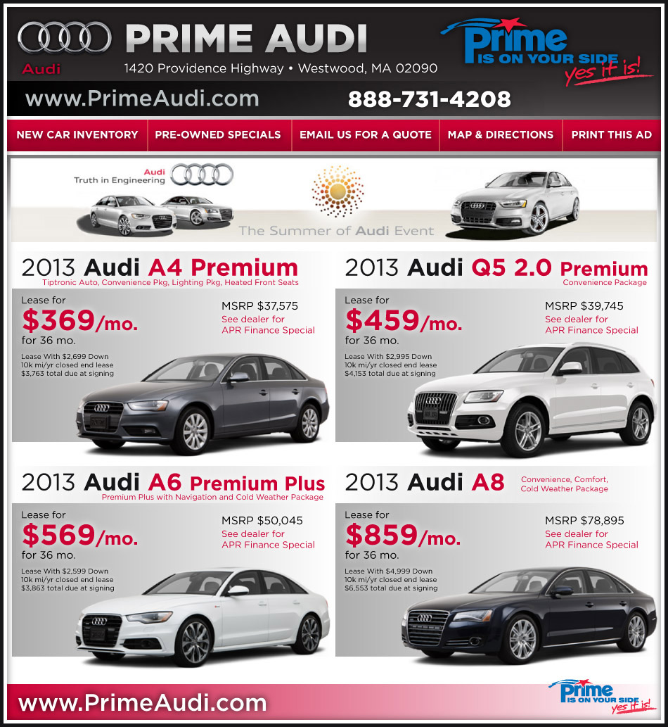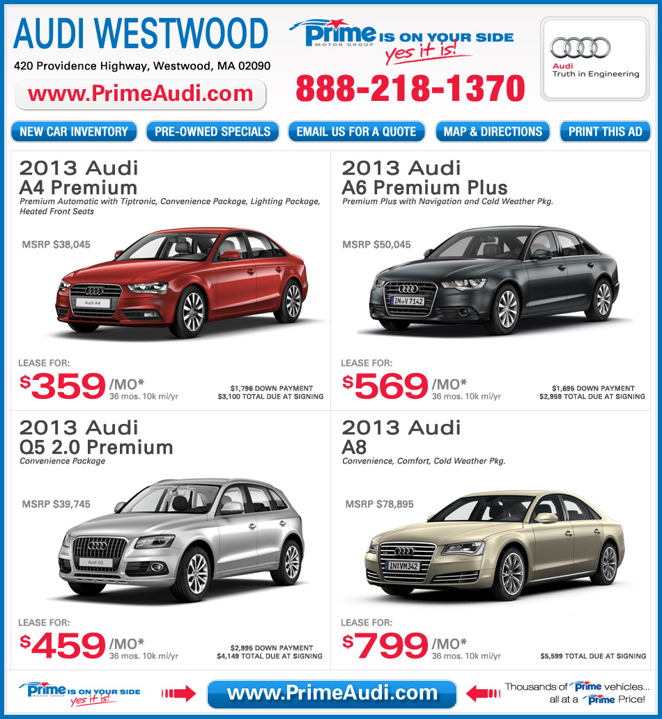 *36-month closed-end lease offered to qualified customers by Audi Financial Services (AFS) through participating dealers. At lease end, lessee responsible for $0.25/mile over 10,000 miles/year, for damage, excessive wear and a disposition fee of $350. Dealer sets actual prices. Lessee responsible for insurance. Additional charges may apply at lease end. Supplies limited. See your Audi dealer for financing details, or for general product information call 1-800-FOR-AUDI. All offers end May 31, 2013. 2013 Audi of America, Inc.