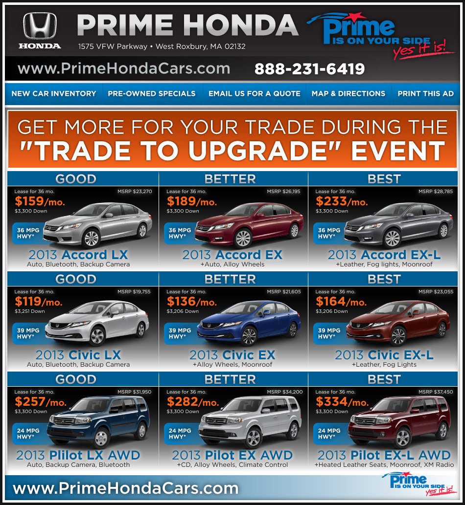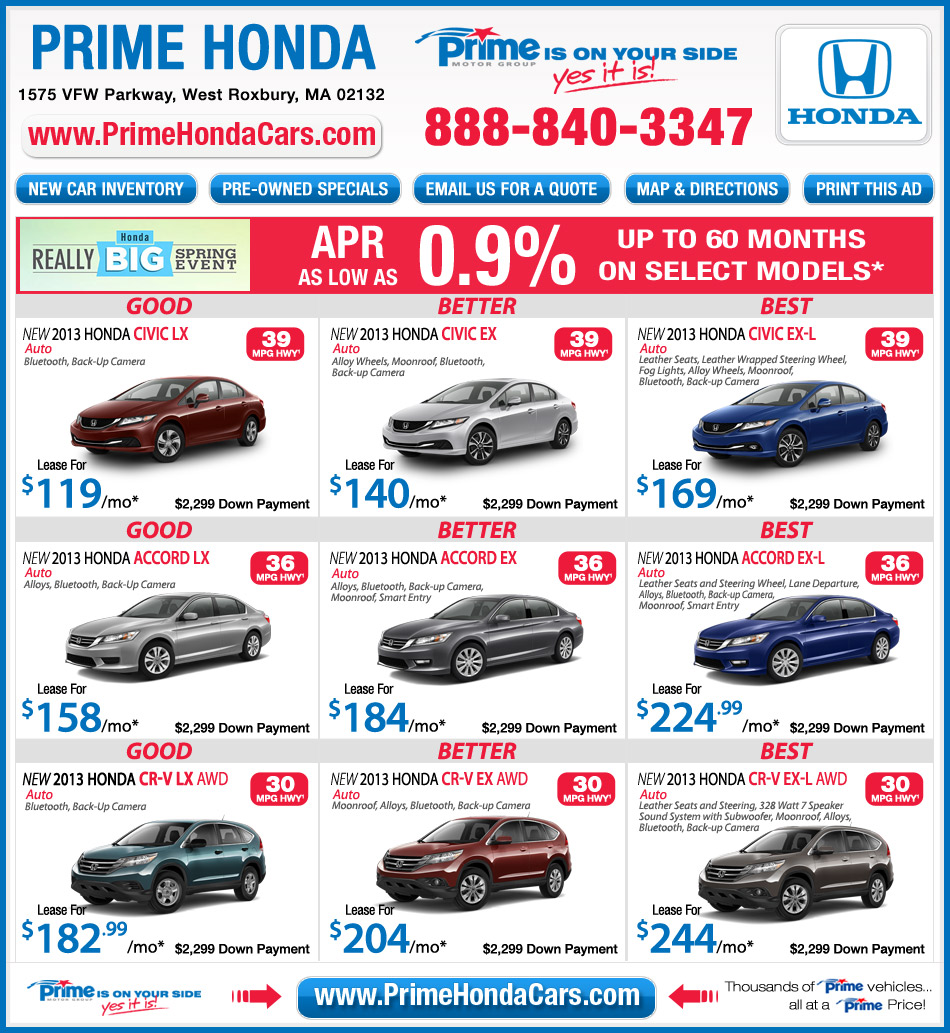 *0.9% Financing Special APR offer valid on new and unregistered select 2012 & 2013 Honda Models to well qualified buyers on approved credit by Honda Financial Services. All leases are 36 months, 12K miles per year, plus $2,299 cash or trade down. 1st payment, acq fee, sales tax, doc fee, plates and registration extra. Leases for well qualified buyers on approved credit from Honda Financial Services. In stock units only. Must take new retail delivery on vehicle from dealer stock by 4/30/2013. [1]Based on 2013 EPA mileage ratings. Use for comparison purposes only. Your actual mileage will vary depending on how you drive and maintain your vehicle. All offers expire 4/30/13.