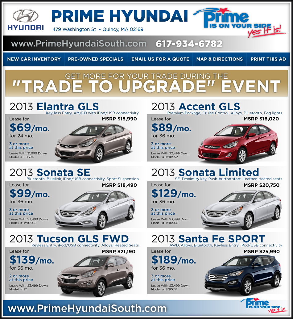 *All rebates to dealer. Must take delivery same day from dealer stock. Leases include valued owner rebate. In stock vehicles only. Leases for Tucson and Santa Fe require $3,499 down. Sonata lease require $3,499 down. Elantra lease requires $1,999 down. Accent lease requires $2,499 down. Excludes tax, title, reg, doc fee, 1st mos payment and $595 acquisition fee. Programs end on 6/30/13. **O% financing available on all 2013 Elantras and 2013 Sonatas only in lieu of $1500 HMF bonus cash. With approved credit only. Ends 6/30/13. ***Lease loyalty program is good through 7/7/13. Only available on current Sonata, Genesis, Genesis Coupe, Veracruz, and Tucson leases. Must mature by 7/8/13 through HMF.
