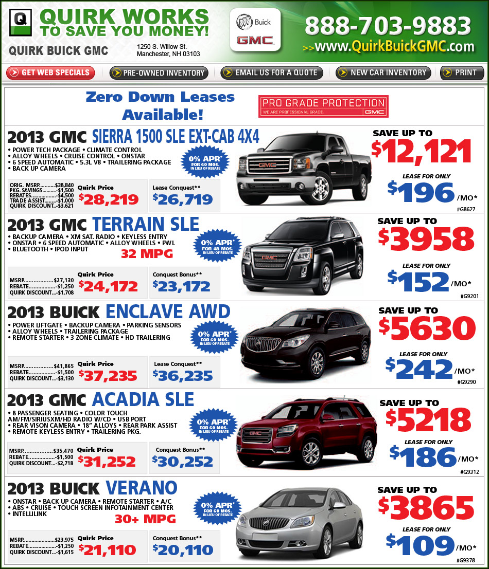 *All leases: $1999 cash/trade down, 39 mos., 10k m/yr, 1st payment, security, acq. fee, title, reg, & doc. fees additional, includes Loyalty or Conquest. **Truck Owner Loyalty: Current owners/lessees ‘99 or newer GM or Chevy vehicles. Buick Conquest Bonus: Current owners/lessees ‘99 or newer non-GM vehicles. Household members are eligible.Termination not required. **Trade Assist requires trade of ‘99 or newer vehicle. See dealer for details & eligible vehicles. Transactions completed at time of sale. Prior sales excluded. Prices subject to manufacturer’s program change without notice. Sale ends 6-30-2013.