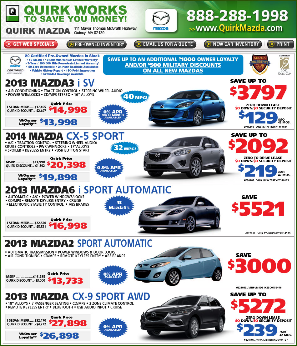 *All incentives to dealer. All leases: $2999 Cash or trade down, 10k miles/year, 1st payment, tax, title, reg., doc. fee additional. Extra charges may apply at lease end. Requires bank approval. Price includes dealer engagement to dealer in lieu of special financing. **Current Mazda Owners. Trade in or lease termination not required. Prior sales excluded. Transaction completed at time of sale. Offers end 6/30/13.