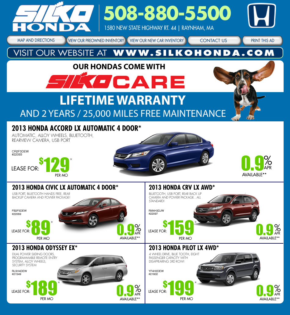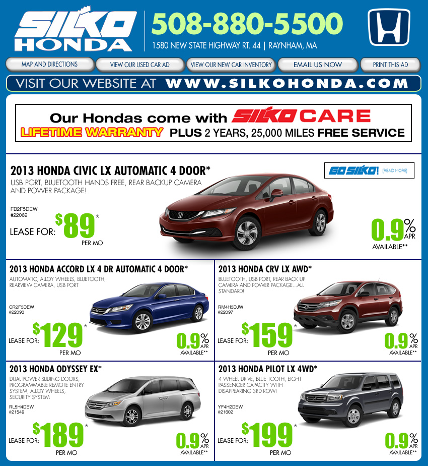 | *IN STOCK VEHICLES ONLY. ALL LEASES ARE $2,299 DOWN CAP REDUCTION. ALL FEES (ACQUISITION, DOCUMENTATION, REGISTRATION AND TITLE FEES) PLUS FIRST PAYMENT ARE ADDITIONAL. SALES TAX IS ADDITIONAL. 2013 HONDA CIVIC LX LEASE, 36 x $89, 62% RESIDUAL. 2013 ACCORD LX LEASE, 36 X $129, 60% RESIDUAL. 2013 HONDA CR-V LX LEASE, 36 X $159, 64% RESIDUAL. 2013 HONDA ODYSSEY EX LEASE, 36 x $189, 56% RESIDUAL. 2013 HONDA PILOT LX LEASE, 36 X $239, 57% RESIDUAL. PICTURES ARE FOR ILLUSTRATIONAL PURPOSES ONLY. LEASES ALL BASED ON APPROVED TIER ONE CREDIT, 12,000 MILES PER YEARS. 15 CENTS PER EXCESS MILE, 20 CENTS PER EXCESS MILE ON VEHICLES WITH MSRP OF OVER $30,000. ALL LEASE RATES ARE FOR 36 MONTHS FOR QUALIFIED APPLICANTS TO AMERICAN HONDA FINANCIAL SERVICES.**0.9% APR OFFERS ARE BASED ON APPROVED TIER ONE CREDIT THRU AMERICAN HONDA FINANCE CORPORATION AND ARE FOR 24-36 MONTHS ON 2013 ACCORDS AND 2013 CIVICS, AND ARE FOR 24-60 MONTHS ON 2013 CR-VS, 2013 ODYSSEYS AND 2013 PILOTS. ALL VEHICLES MUST BE PAID FOR, IN FULL, AT TIME OF SALE. NOT APPLICABLE TO PREVIOUS PURCHASES OR LEASES. ACCESSORIES ADDITIONAL. RESIDENCY RESTRICTIONS APPLY. LEASE SPECIALS FOR MA, RI, CT AND NH RESIDENTS ONLY. ASK FOR DETAILS. SALE ENDS 5/31/13. |