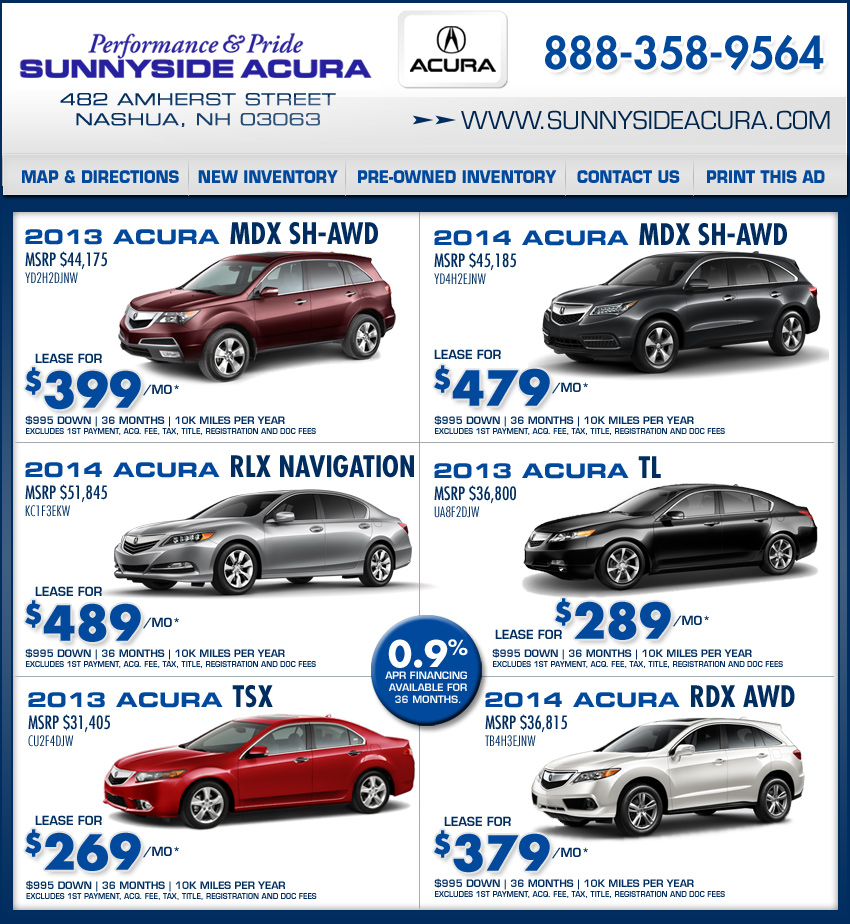*For well qualified buyers through AFS. All leases 36 months, 10k miles/year. $995 down for TL, ILX, TSX. $1995 down for MDX. $2995 down for RDX. Excludes acq. fee, tax, title, registration and doc fees. All offers in stock units only. Expires 5/31/13.