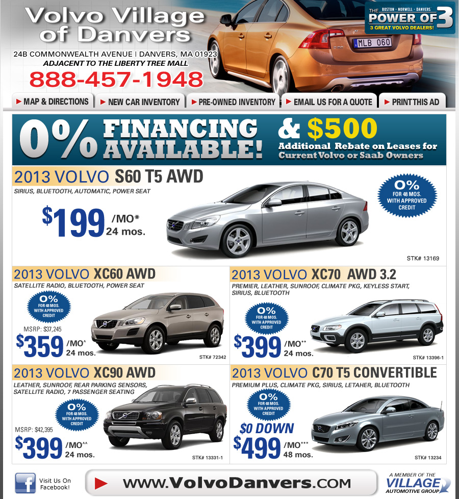 10,000 miles per year. *$3,198 Cap Cost reduction $795 bank fee, $289 doc. fee, Ma. reg. fee extra. Tier 1 credit approval required. Not all customers will qualify. **$3,395 Cap Cost reduction $795 bank fee, $289 doc. fee, Ma. reg. fee extra. Tier 1 credit approval required. Not all customers will qualify. ***$2,995 Cap cost reduction. $795 bank fee, $289 doc. fee, Ma. reg. fee extra. Tier 1 credit approval required. Not all customers will qualify. Pictures for illustration purposes only. Sale ends 5/31/13.