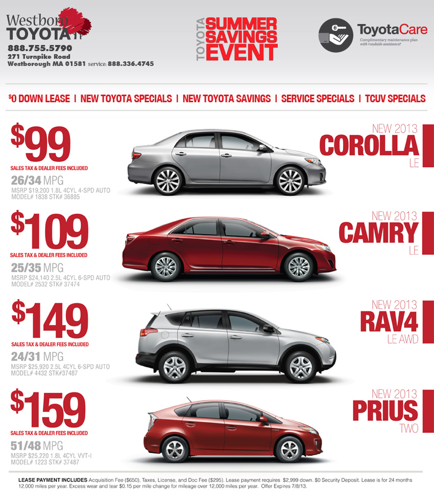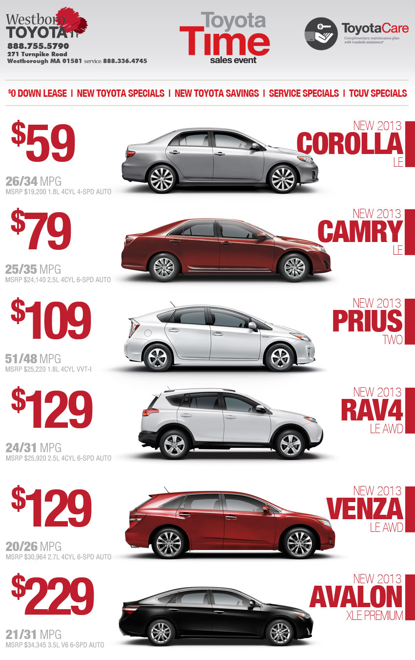 TERMS AND CONDITIONS Toyota Lease Specials Disclaimer Lease payment requires $2,999 down. Lease Payment does not includes Aquisition Fee ($650), taxes, license, and doc fee ($295). $0 Security Deposit. Lease is for 24 months 12,000 miles per year. Excess wear and tear $0.15 per mile change for mileage over 12,000 miles per year. Program available through Toyota Financial Based on Tier1+ credit. Valid through June 3, 2013. 2012 4Runner, 2013 Avalon, 2012 Camry, 2013 Land Cruiser, 2012 Prius c, 2013 Prius c, 2012 Prius Plug In, 2012 Prius v, 2013 RAV4, and 2013 Tacoma APR is 2.9% up to 60 mos. with Tier 1+ credit only, 60 monthly payments of $17.95 for each $1000 borrowed. 2013 Corolla, 2013 Prius and 2013 Venza APR is 0.0% up to 60 mos. with Tier 1+, 1, 2 and 3 credit only, 60 monthly payments of $16.67 for each $1000 borrowed. 2013 Highlander APR is 0.0% up to 36 mos. with Tier 1+, 1, 2 and 3 credit only, 36 monthly payments of $27.78 for each $1000 borrowed. 2013 Tundra In APR is 0.0% up to 60 mos. with $1,000 subvention cash provided by TFS with Tier 1+, 1, 2 and 3 credit only, 60 monthly payments of $16.67 for each $1000 borrowed. 2013 Camrys APR is 0.0% up to 60 mos. with Tier 1+ and 1 credit only, 60 monthly payments of $16.67 for each $1000 borrowed. 2013 Prius v APR is 0.0% up to 48 mos. with Tier 1+ and 1 credit only, 48 monthly payments of $20.83 for each $1000 borrowed. 2013 Camry Hybrid APR is 0.0% up to 36 mos. with Tier 1+ and 1 credit only, 36 monthly payments of $27.78 for each $1000 borrowed. 2013 Prius Plug In APR is 0.0% up to 60 mos with $3,500 subvention cash provided by TFS with Tier 1+ and 1 credit only, 60 monthly payments of $16.67 for each $1,000 borrowed. 2013 Sienna APR is 0.0% up to 60 mos with $325 subvention cash provided by TFS with Tier 1+ and 1 credit only, 60 monthly payments of $16.67 for each $1,000 borrowed. Complimentary Two Year Maintenance Plan Complimentary maintenance plan for 2 years or 25,000 miles whichever comes first with purchase or lease of new Toyota. Maintenance plan covers manufacture schedule maintenance and road side assistance, does not cover brakes or tires. Plan covers factory scheduled service. Neither the current qualifying vehicle nor the new Toyota vehicle may be part of a rental or commercial fleet or a delivery or taxi vehicle. See plan for complete coverage details. Plan from Toyota. See dealer for details. |