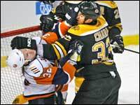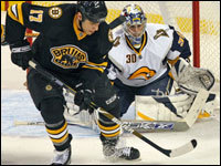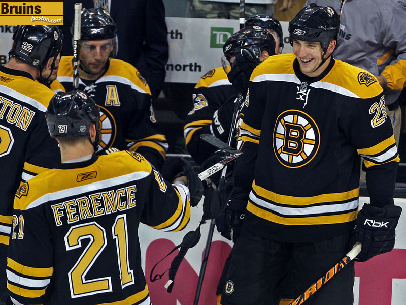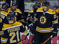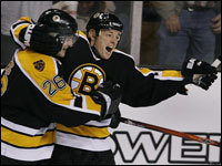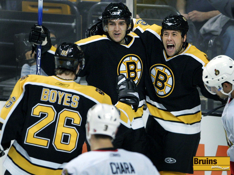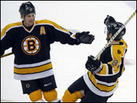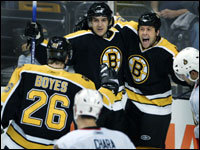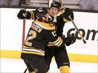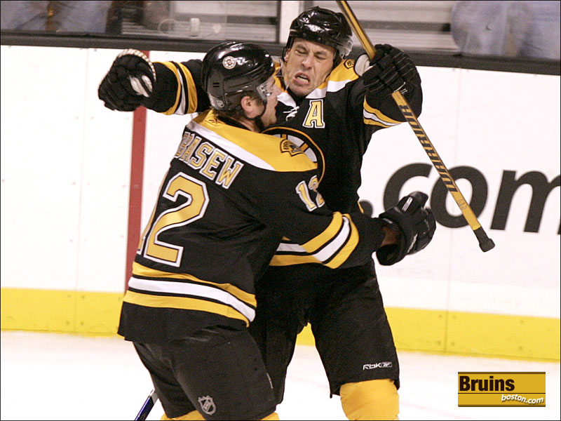 Mark Mowers (right) celebrates his first goal of the season, a third period tally that put Boston ahead 4-1. Brad Boyes is at left. (Globe Staff Photo / Jim Davis)