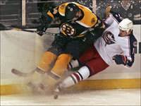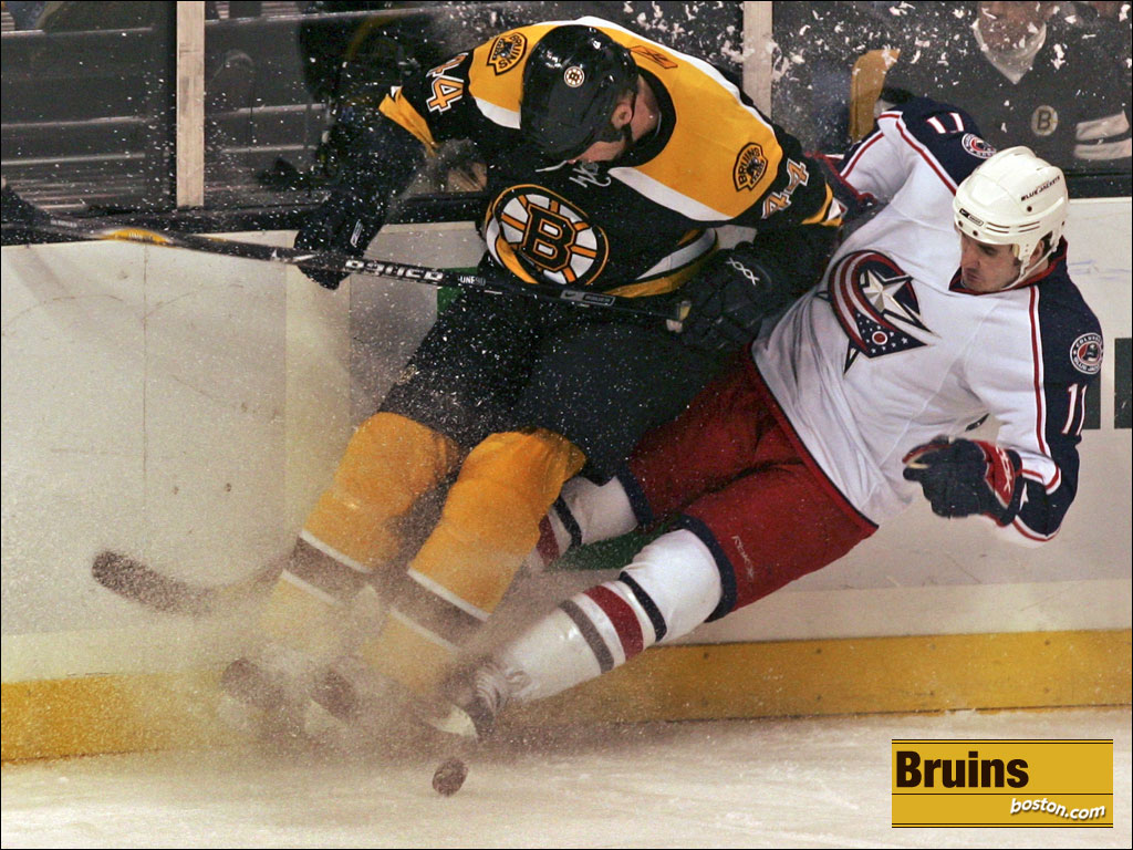 Bruins player Aaron Ward (44) and Blue Jackets player Curtis Glencross (11) hit the boards during first period action at the TD Banknorth Garden. (Globe Staff Photo / Justine Hunt)
