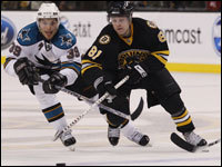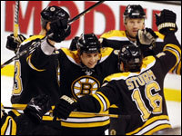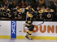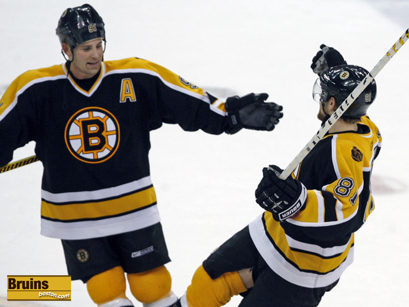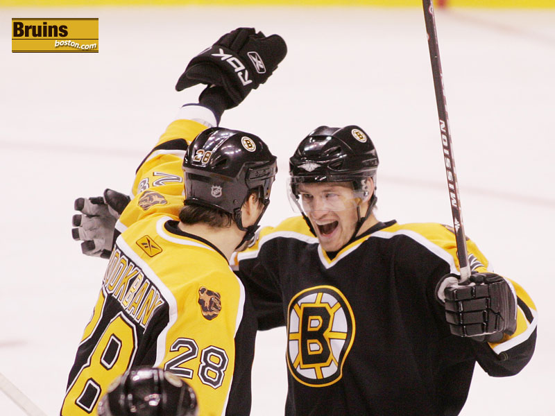 Boston Bruins' Marco Sturm celebrates his 1st period goal with teammate Chuck Kobasew after his goal put the Bruins up 3-1. (Globe Staff Photo / Barry Chin)