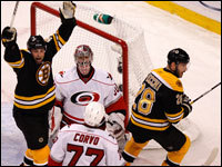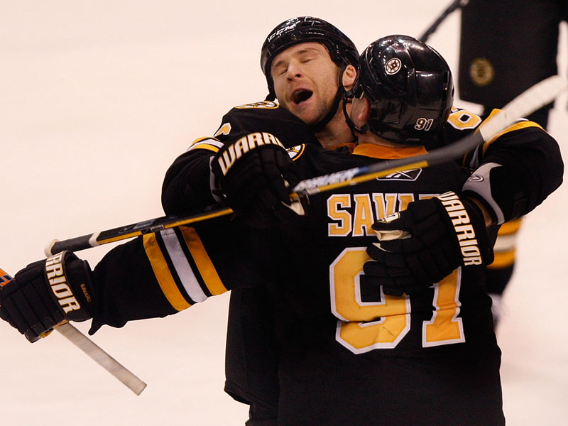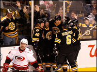 Bruins center Marc Savard celebrates after teammate Mark Recchi (right) scored in the first period against the Carolina Hurricanes. (Globe Staff Photo / Barry Chin)
