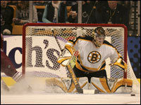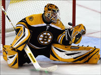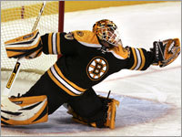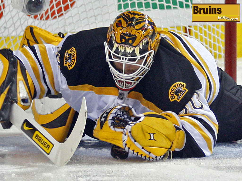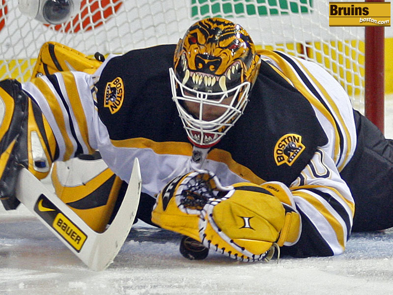 Boston goalie Tim Thomas looks like the bear painted on his helmet as he pounces on the puck. (Globe Staff Photo / Matthew J. Lee)