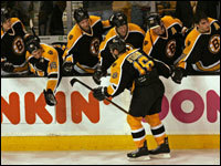 Bruins forward Stephane Yelle (left) is surrounded by his teammates after scoring a goal against Carolina. (Globe Staff Photo / Barry Chin)