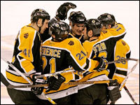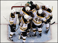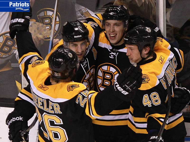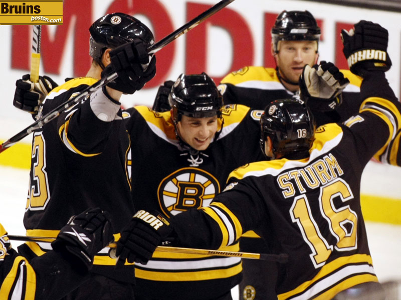 The Bruins celebrate Marco Sturm's empty net goal, which iced a 3-0 win for Boston. (Globe Staff Photo / Barry Chin)