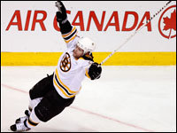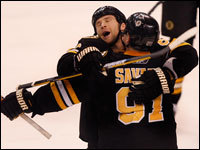 Bruins forward Marc Savard seems ready to fly after scoring an overtime game-winner against the Montreal Canadiens. (Globe Staff Photo / Jim Davis)