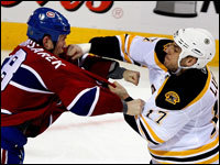 Milan Lucic connects with a punch to the face of Montreal Canadiens defenseman Mike Komisarek. (Globe Staff Photo / Barry Chin)