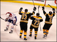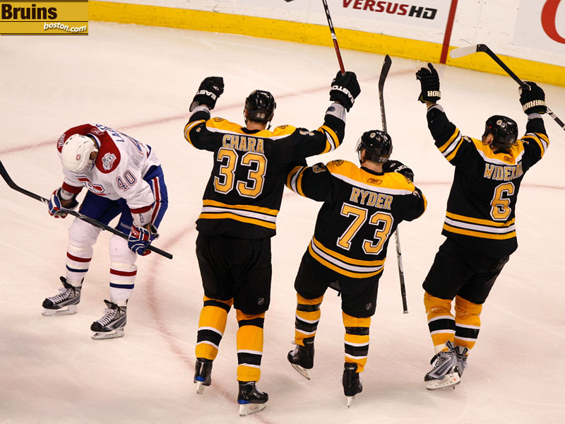 Zdeno Chara, Michael Ryder and Dennis Wideman celebrate a goal as Montreal's Maxim Lapierre looks down. (Globe Staff Photo / Barry Chin)