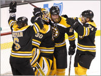 Bruins goalie Tim Thomas and his teammates get the celebration started. (Globe Staff Photo / Barry Chin)