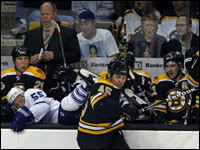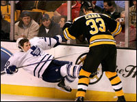 Fans, Bruins players and coach Claude Julien reacted to Mark Stuart's thunderous hip check that sent Toronto's Jason Blake over the boards and into the Bruins' bench. (Globe Staff Photo / Jim Davis)